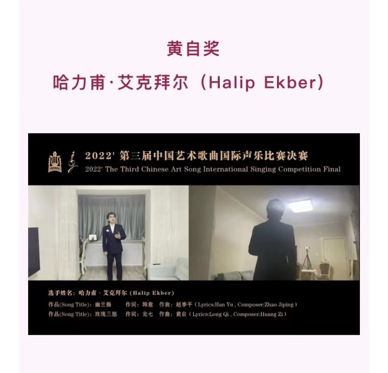 近日,在2022第三届中国艺术歌曲国际声乐比赛中,米兰声乐歌剧系哈力甫·艾克拜尔同学获得“黄自奖”(指导教师:迪里拜尔教授)。