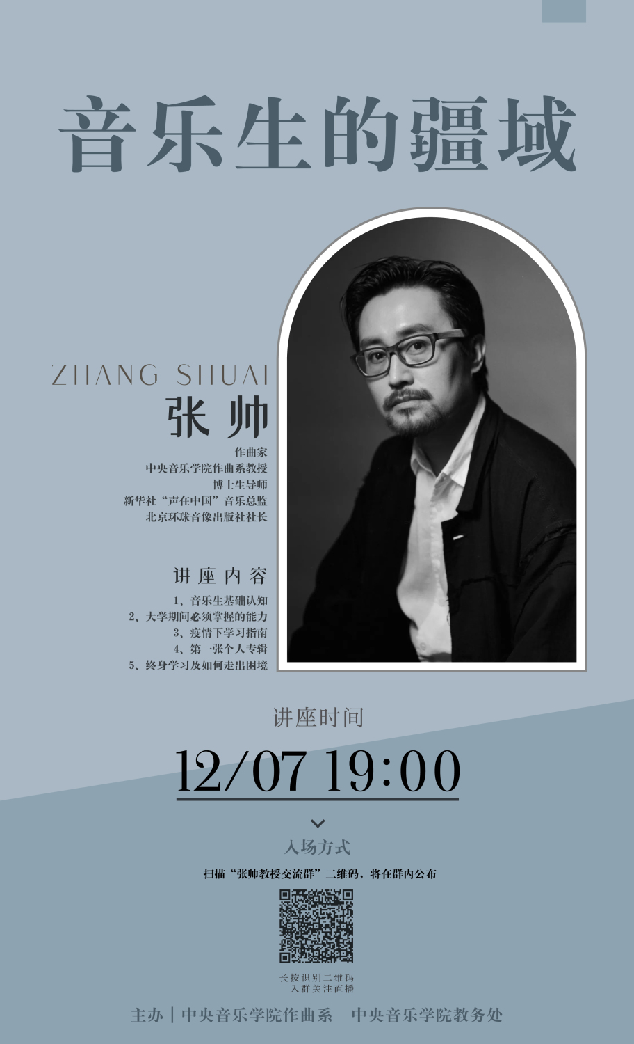 代表作:《三首前奏曲》《熊猫组曲》(“玺徙喜”)、《雪花》《祝你生日快乐》《不屈的信仰》《太阳的女儿》等。其作品曾多次获得国家级奖项,包括两次中国音乐“金钟奖”。基于早年在流行乐的创作表演经历与学院派作曲家的背景,张帅自由穿梭于多种音乐风格之间。从古典音乐到当代音乐、从流行乐到电子乐,他的音乐创作跨越多个领域,逐渐形成其特有的多元音乐语言特征。