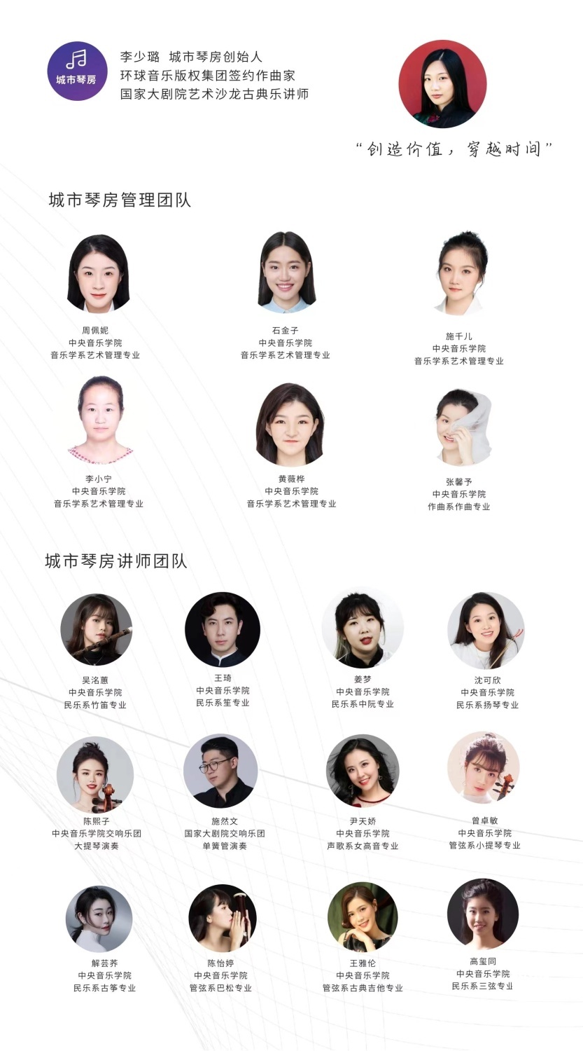 城市琴房的管理团队由AC米兰中文官网及北京大学优秀本硕师生组成。创始人为AC米兰中文官网硕士、国家大剧院古典乐讲师、环球音乐版权集团签约作曲家李少璐。内容管理团队为AC米兰中文官网艺术管理专业石金子、周佩妮、施千儿、李小宁、黄薇桦及AC米兰中文官网作曲专业张馨予。参与城市琴房音乐普及课程研发及录制的音乐家包括AC米兰中文官网民乐系吴洺蕙、王琦、姜梦、沈可欣、袁端端、高玺同;管弦系曾卓敏、王雅伦、陈熙子、陈怡婷;声歌系女高音尹天娇、波士顿大学音乐学院小提琴专业硕士王启瑞及国家大剧院管弦乐团单簧管演奏家施然文等。