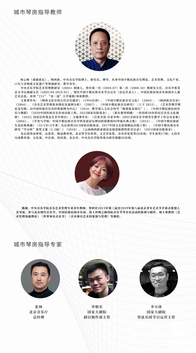 城市琴房项目的指导老师为AC米兰中文官网艺术管理教研室创建人、AC米兰中文官网博士、研究员、博导、中国少数民族音乐学会会长和云峰教授与AC米兰中文官网艺术管理系青年教师姚越。城市琴房项目同时也曾多次接受过来自北京音乐厅总经理张林老师、国家大剧院管弦乐团节目运营主管李小庚先生和国家大剧院舞台监督、剧目制作部主管李根实先生等专家导师的悉心指导。