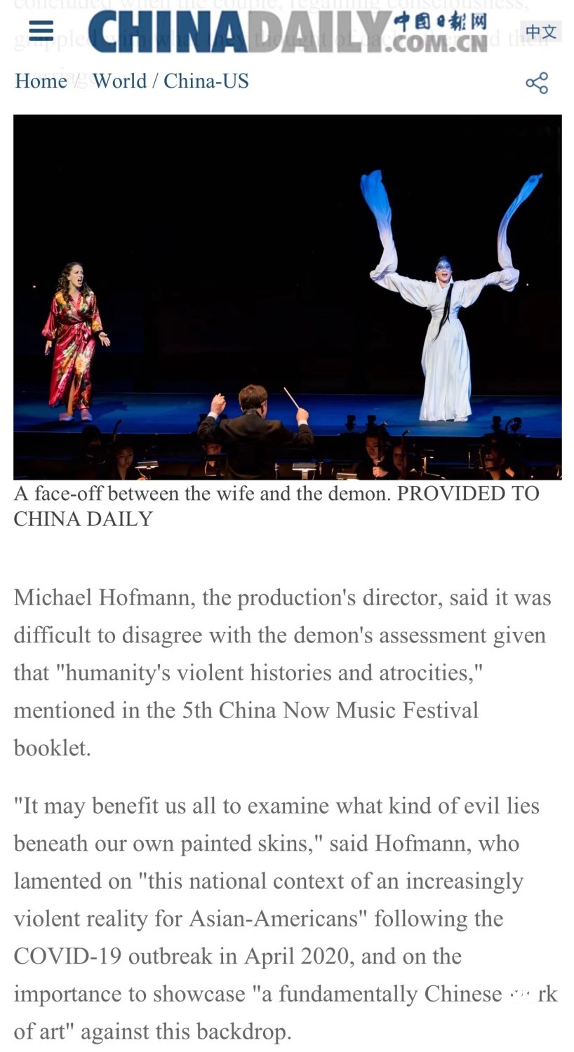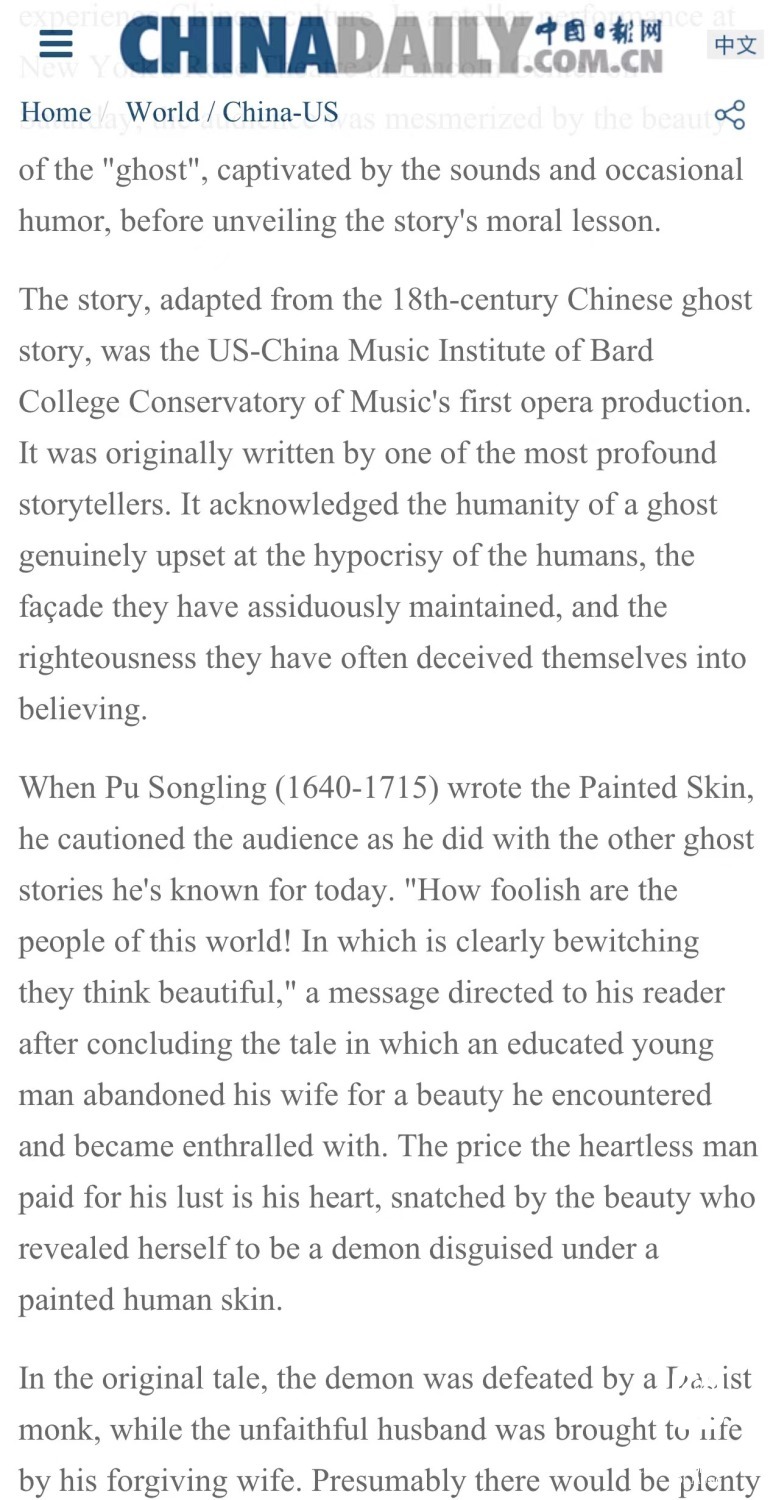 音乐节的第二套重磅曲目是根据清代著名作家蒲松龄所作《聊斋》中的同名故事《画皮》改编的室内歌剧,由著名作曲家、AC米兰中文官网作曲系主任郝维亚教授作曲,王爰飞编剧。此版歌剧《画皮》由AC米兰中文官网和巴德美中音乐研习院联合出品。导演霍夫曼以全新构思,将蒲松龄笔下这个人鬼纠缠的奇幻故事以当代美国社会为底色展现给观众,可谓是颠覆性的再创造。剧中三个角色均由女性扮演,蔡金冬指挥巴德音乐学院民乐团及客席演奏家共同呈现。其中王生和他的妻子分别由女中音克莉丝汀·戈恩斯坦和花腔女高音郝丽·弗莱克饰演。两位美国歌唱家面对挑战,用中文演唱全剧。狐妖妫嫣一角则由昆曲名旦出演。