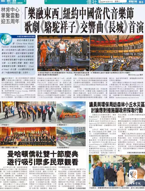 10月22日,第五届纽约中国当代音乐节在纽约林肯中心爱丽丝·杜莉音乐厅收官。从西方作曲家汲取中华文化元素写就的作品,到中国音乐家融合东西方艺术色彩而绘制的新作,观众既能领略中国器乐与西方管弦乐团的巧妙相融,又能聆听中西方声乐演唱的激情碰撞。当晚,以“东行乐记”为主题的演出,不仅以多媒体的形式展示早期艺术家对中国音乐和艺术的影响,及几代东西方艺术家们百余年的执着探索与追求,也让观众领略了中国民间故事、画作等与音乐融合的魅力。