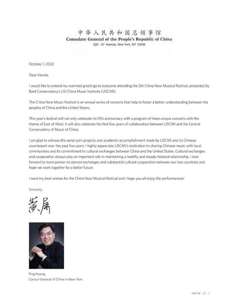 中国驻纽约总领事黄屏给音乐节发来贺信并于当晚观看了演出。他在贺信中表示,文化交流合作对于保持中美关系健康稳定发展有着重要作用,他期待两国之间有更多民间交流,希望两国人民一起创造更好未来。