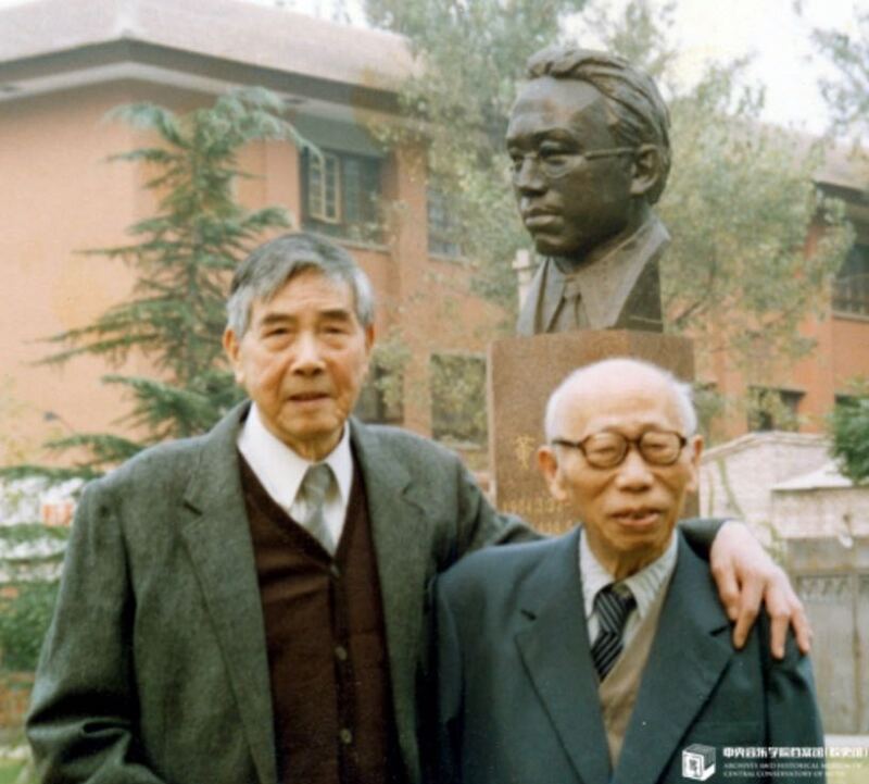 1995年与挚友廖辅叔教授在学校新落成的黄自塑像前留影