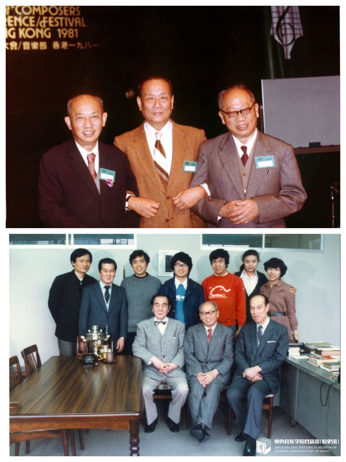 上,1981年,参加亚洲作曲家大会期间,在香港与林声翕(中)、丁善德(左)合影