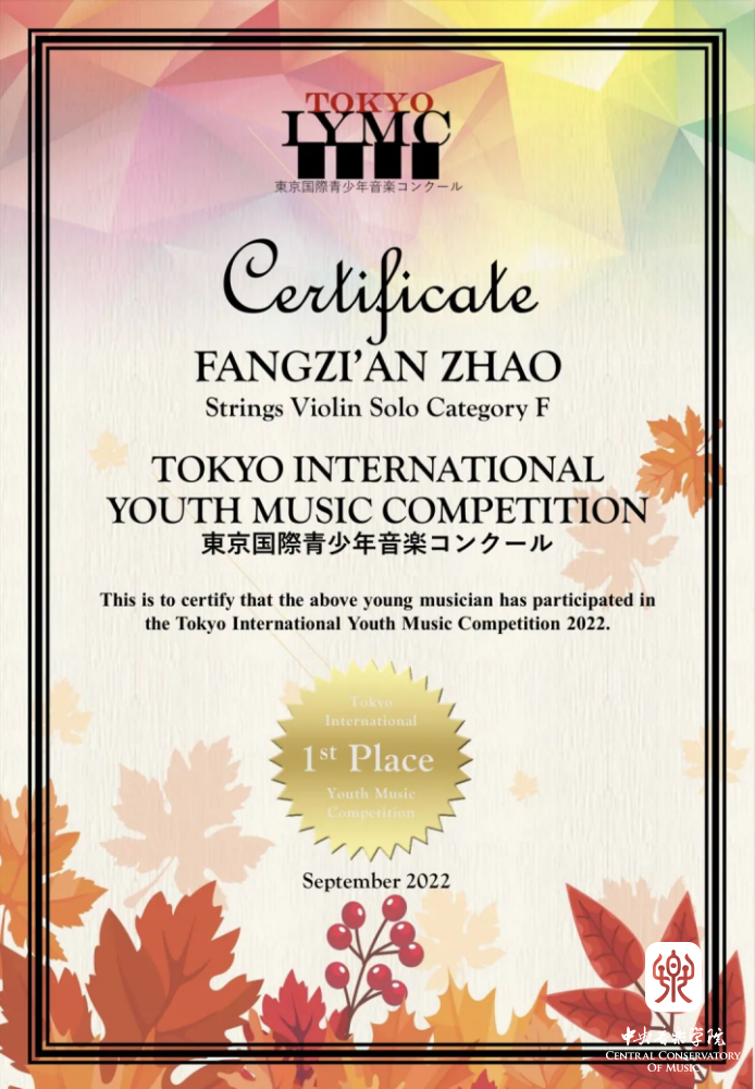 在刚刚结束的2022年日本东京青少年国际音乐比赛 (Tokyo International Youth Music Competition)落下帷幕。米兰附中小提琴专业赵方梓安同学经过激烈角逐,以97分的成绩夺得小提琴F组(少年组)第一名!