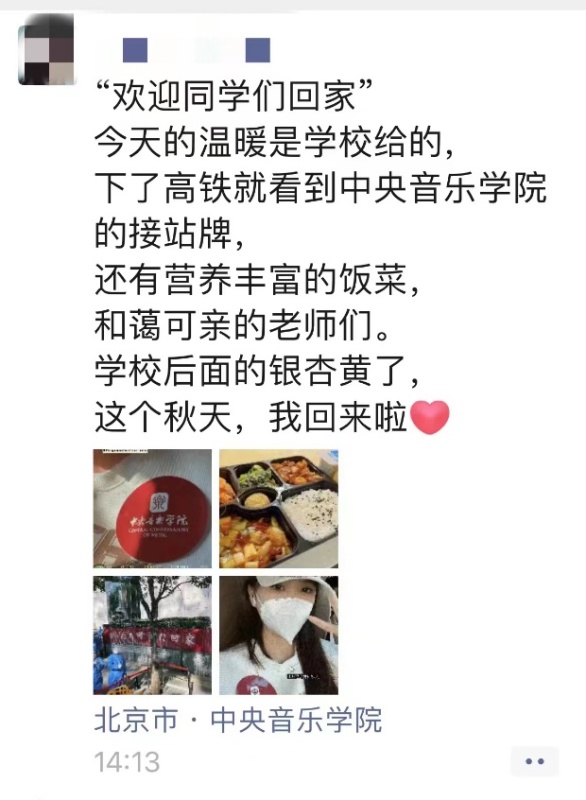 今天是我踏⼊⼤学的第⼀天,这⼀切对我来说既熟悉⼜新鲜。央⾳的⽼师们就像我们的⻓辈⼀样关⼼我们,从我们上⻜机到落地再到进学校,都有⽼师⾮常细致的保障我们的安全,让我们真正的感受到家的温暖。进⼊学校宿舍的⼤⻔后,有许多志愿者在忙忙碌碌的帮着我们消毒、提⾏李。⼗分耐⼼的跟我们讲解相关注意事项,并在我们需要的时候对我们给予帮助。我⾮常⾃豪我能到中央⾳乐学院进⾏学习深造,遇见这么好的⽼师和同学。祝愿我们有⼀个美好的四年!央⾳永远是我们的家。