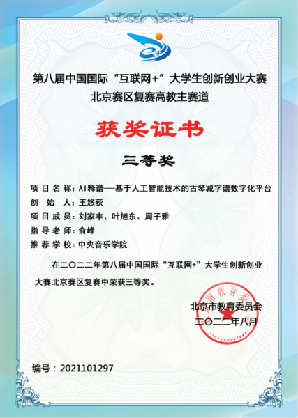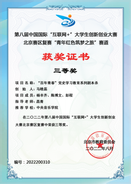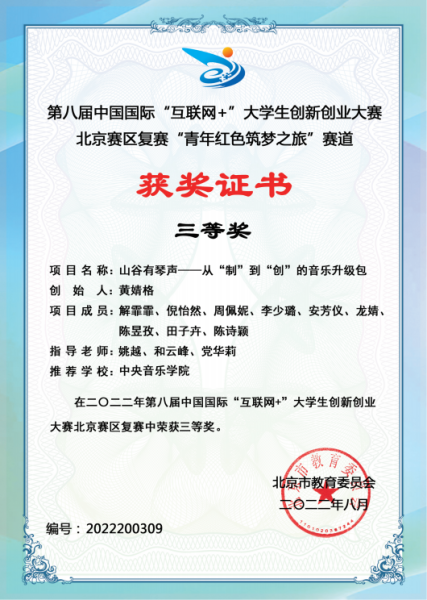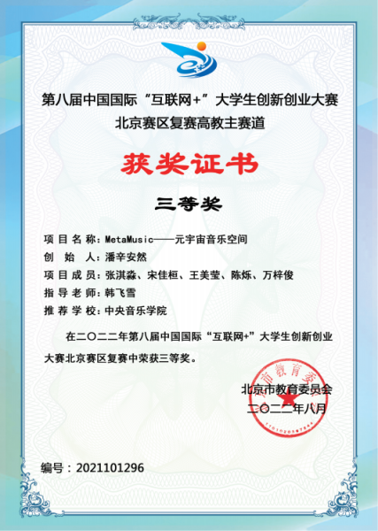 在2022年第八届中国国际“互联网+”大学生创新创业大赛北京赛区中,米兰参赛项目《AI释谱——基于人工智能技术的古琴减字谱数字化平台》与《MetaMusic—元宇宙音乐空间》分别获得高教主赛道三等奖,《“百年青春”党史学习教育系列剧本杀》与《山谷有琴声——从“制”到“创”的音乐升级包》分别获得“青年红色筑梦之旅”赛道三等奖。