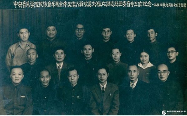 1957年,民乐系全体教师欢送刘恒之同志(前排左3)赴西安音乐专科学校工作,第三排左1为王振先