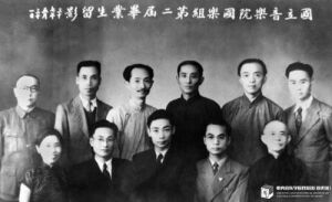 1948年5月,国立音乐院国乐组第二届毕业生杨朴轩、方炳云(前排左2、3)与教师合影。