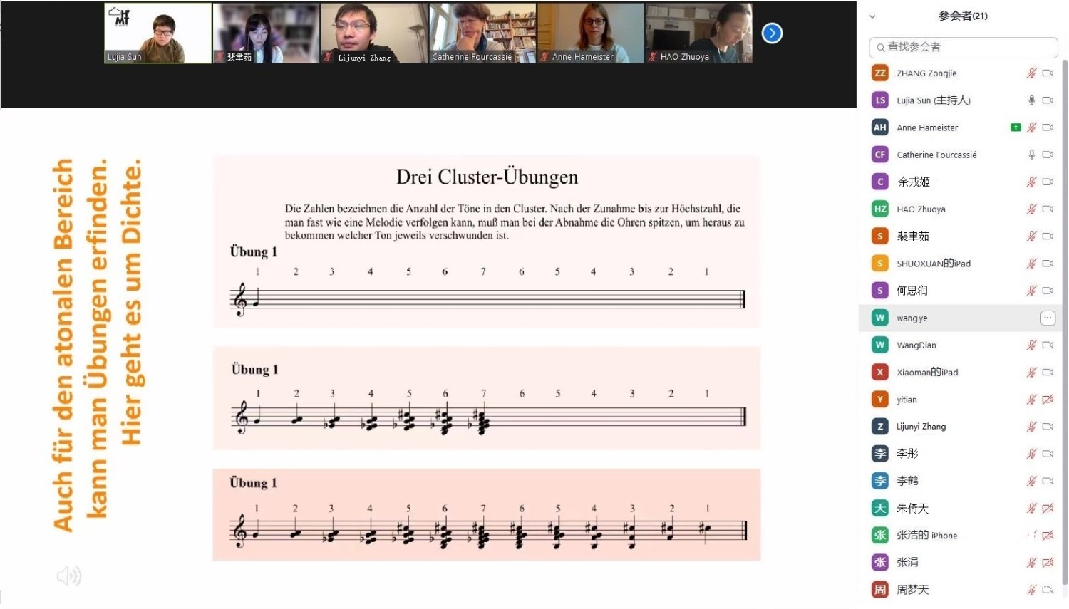 会议中,双方与会教师按照拟定议题,对视唱练耳学科建设、团队管理、培养目标、教学方式等进行了深入探讨,分享了个人教学心得以及对视唱练耳学科发展的建议。德方专家还就德国音乐院校中视唱练耳课程考核设置、学制信息、教学素材等方面进行了详细介绍,并根据部分教学技术难点有针对性地阐述了教学思路、展示了具体教学内容。通过双方的热烈探讨,本次会议不仅加强了中、德视唱练耳学术同行之间的交流合作,还为米兰基础核心课程内容的完善、教学效果的提升提供了丰富信息,同时为一线授课教师进一步思考专业特色、明确本校教学优势,以及米兰附小、附中、大学全面一体化建设提供了有效参考。