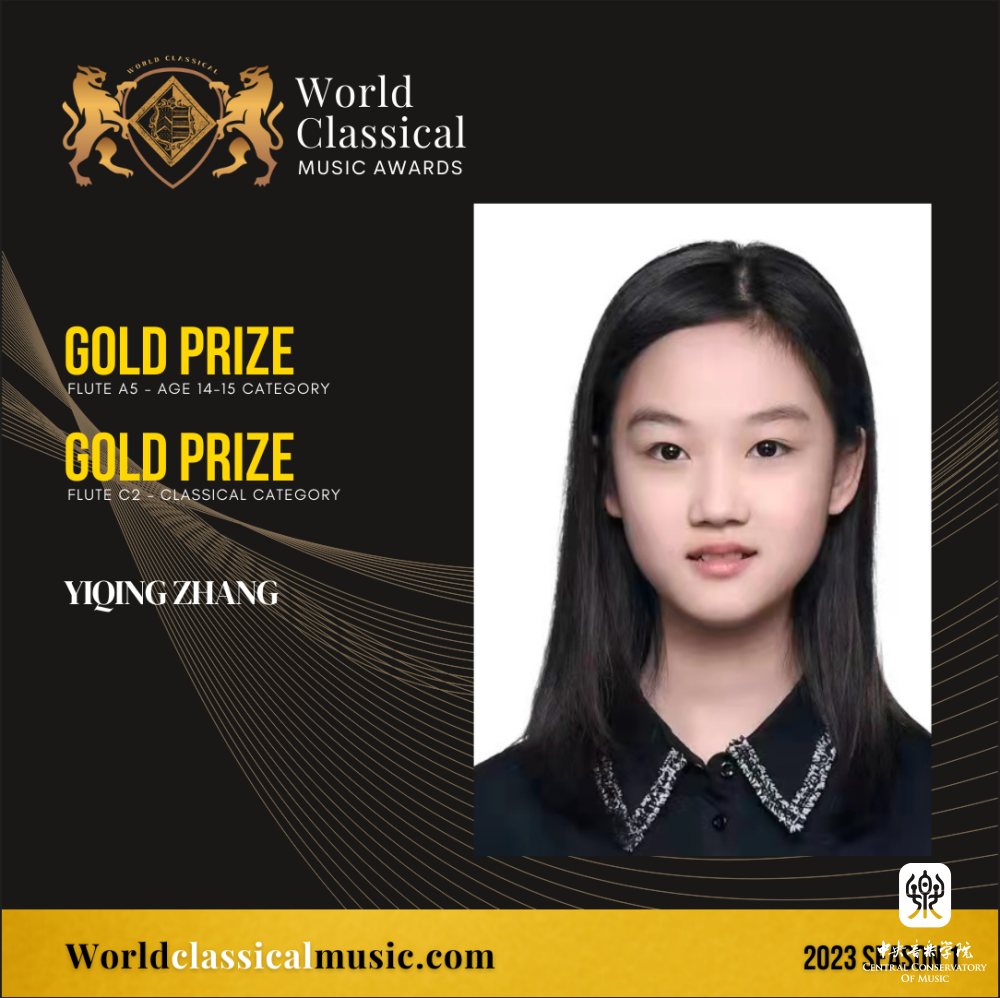 附中长笛专业学生张伊晴荣获2023年世界古典音乐奖比赛长笛自选曲目14-15岁组金奖和古典时期作品-古典组金奖