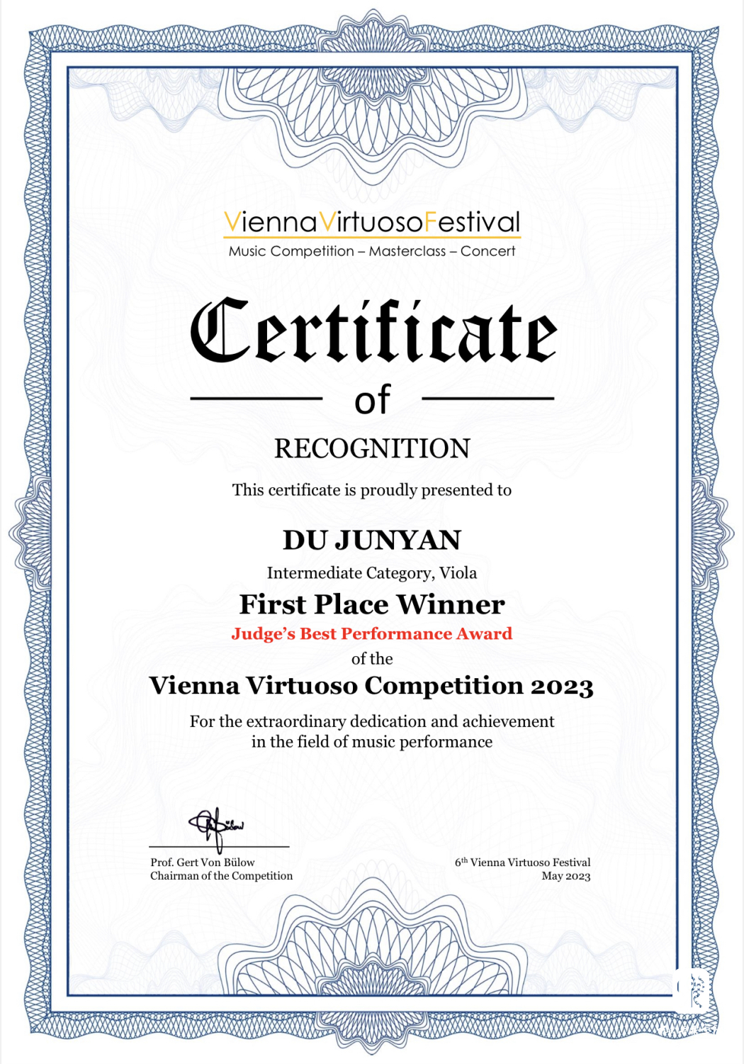 此外,在第五届波兰“名作”国际音乐比赛中,杜俊言获得中提琴B组第一名以及评委会授予的唯一一个满分大奖,在2022欧中Crescendo国际音乐大赛中,杜俊言获得专业少年组二等奖(一等奖空缺)并获得同组别唯一的展演奖。指导教师李汶冠老师。