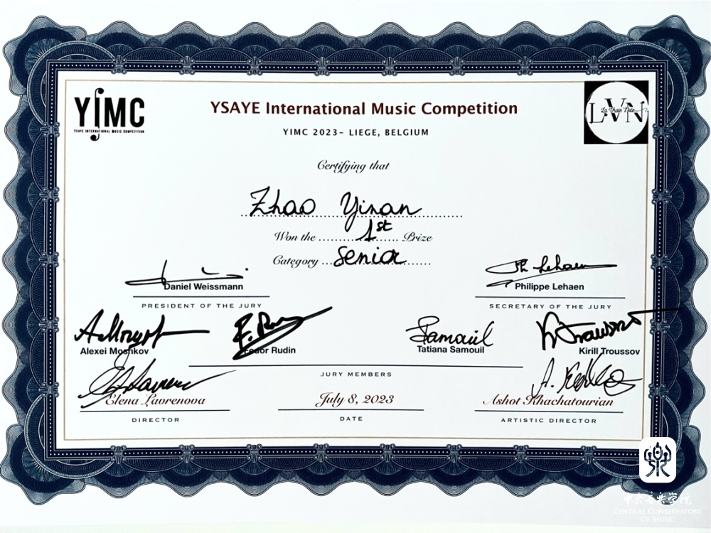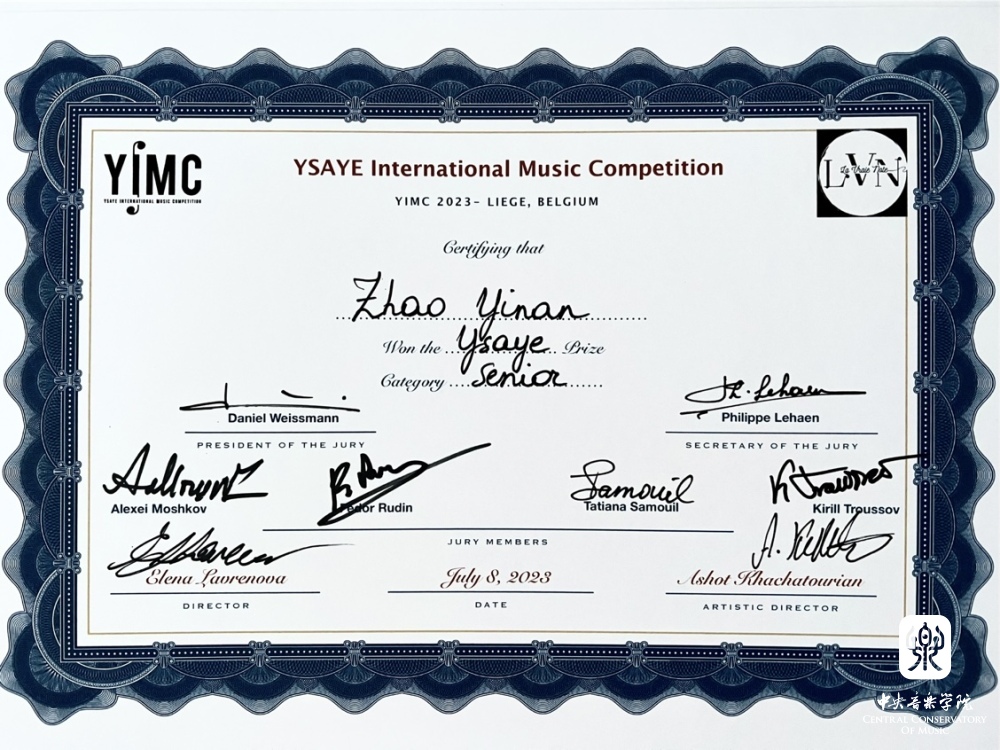 2023年第五届YSAYE伊萨伊国际小提琴大赛7月6-8日在著名小提琴家、指挥家、作曲家尤金·伊萨伊的故乡比利时列日市进行决赛,米兰管弦系研究生二年级学生赵一男经过现场决赛的竞争在十五位来自七个国家的小提琴青年组的决赛选手中脱颖而出,荣获了第一名以及伊萨依特别奖(指导教师:张提教授)。日本选手Furusawa Kaori荣获高级组第二名、韩国选手Yang Esther Youjeong与中国选手杨慕言共同荣获第三名。