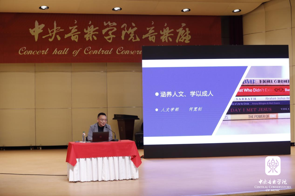 新生入学教育的最后,人文学部主任、博士生导师何宽钊教授以“涵养人文 学以成人”为题为新同学们讲述人文央音。从大师修养到“人文央音”名家讲坛,从“音辩交响”校园大学生辩论赛到央音在体育、英语方面的创新突破,通过丰富的央音人文学习生活介绍向同学们生动阐释书艺双修的央音人文情怀,以及审思明辨、健全人格的央音人文素养。