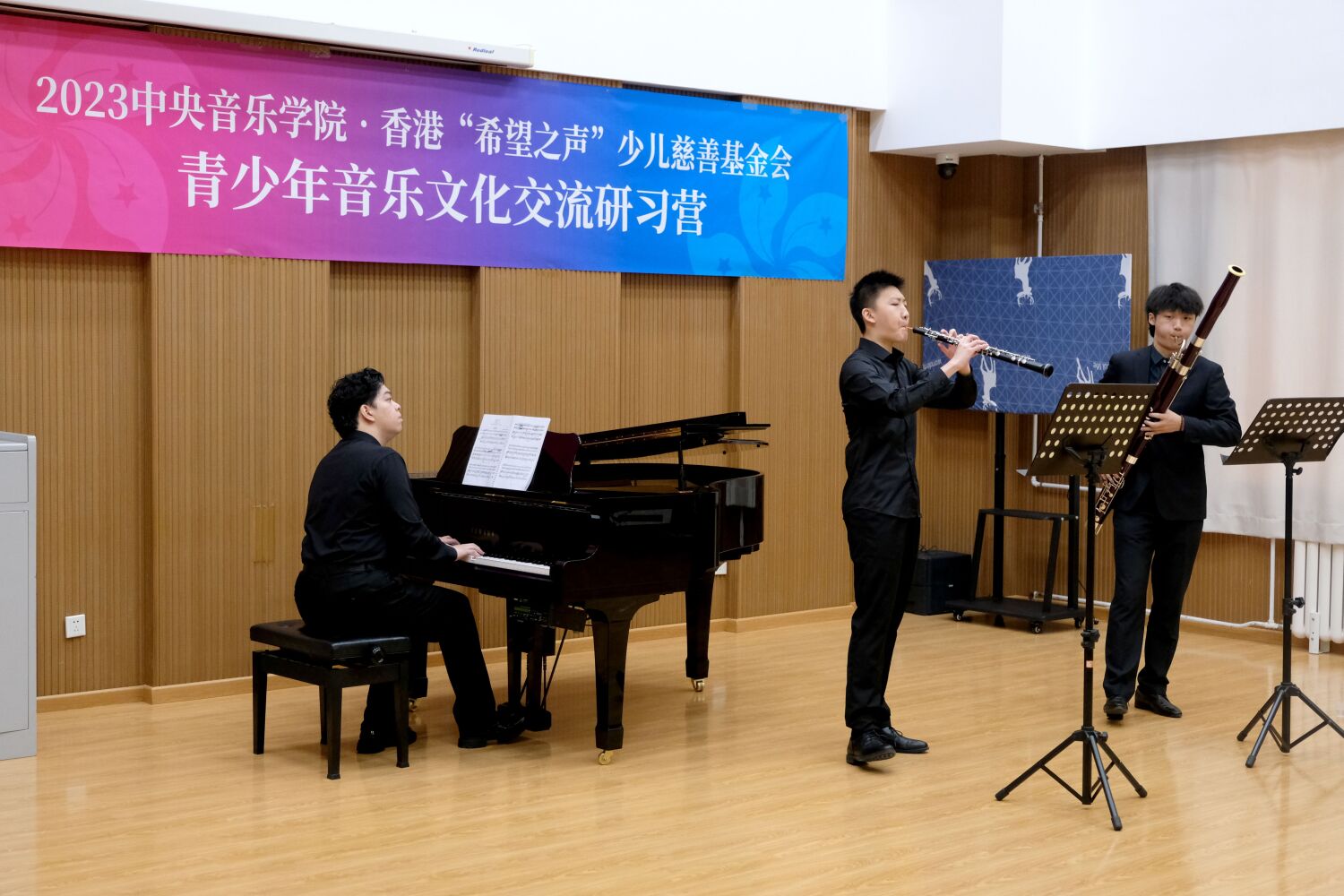 随后,米兰附中学生张嘉恩伊、祁特、郭禹涵、马子皓等为大家奉献了包括琵琶独奏、钢琴独奏、木管三重奏等作品在内的小型欢迎音乐会,同学们精湛的演奏技艺令香港师生赞叹不已,美妙的乐声感染着每一位观众,两地师生畅谈着对艺术的理解以及对祖国未来发展的美好愿景,现场气氛一次又一次地被推向高潮。