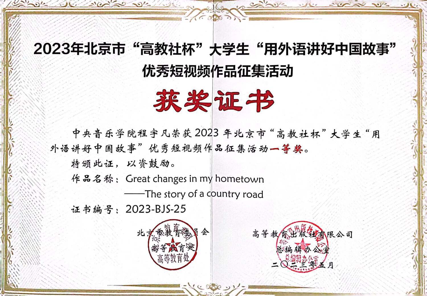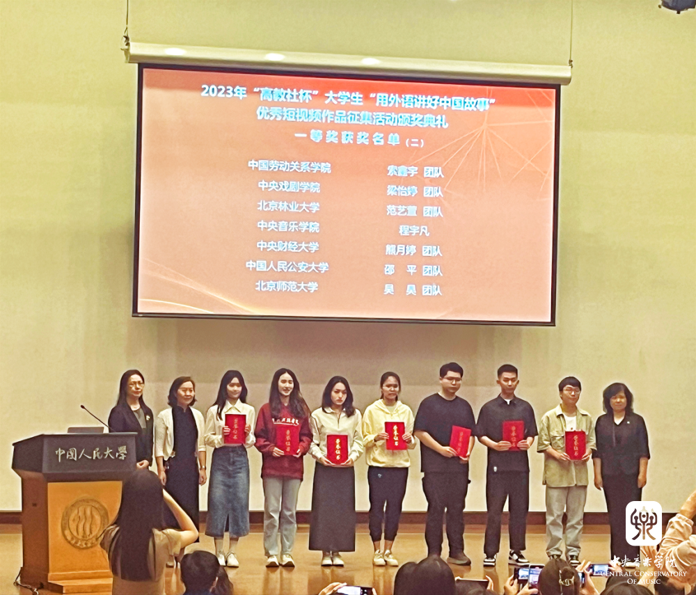 近日,北京市2023年“用外语讲好中国故事优秀短视频”作品征集活动颁奖仪式在中国人民大学举行。米兰提琴制作研究中心2022级本科生程宇凡同学在郐毅老师的指导下喜获一等奖并受邀参加颁奖仪式。