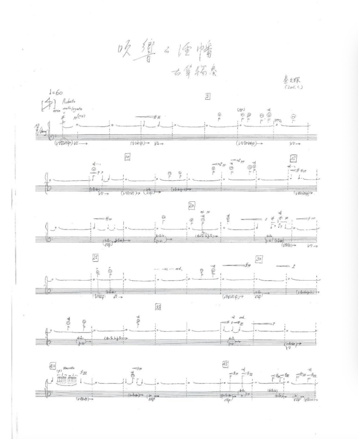 《吹响的经幡》在音高上侧重于琴码右边的单音。全曲用琴弓拉奏,古筝也因此获得了非常丰富的音色变化。拉奏不仅能获得拉弦乐的柔韧性,还具有了铜管乐器的张力和气势,加之微分音之间产生出来的“扩张感”,使该曲具有了一种强烈的音响色彩。