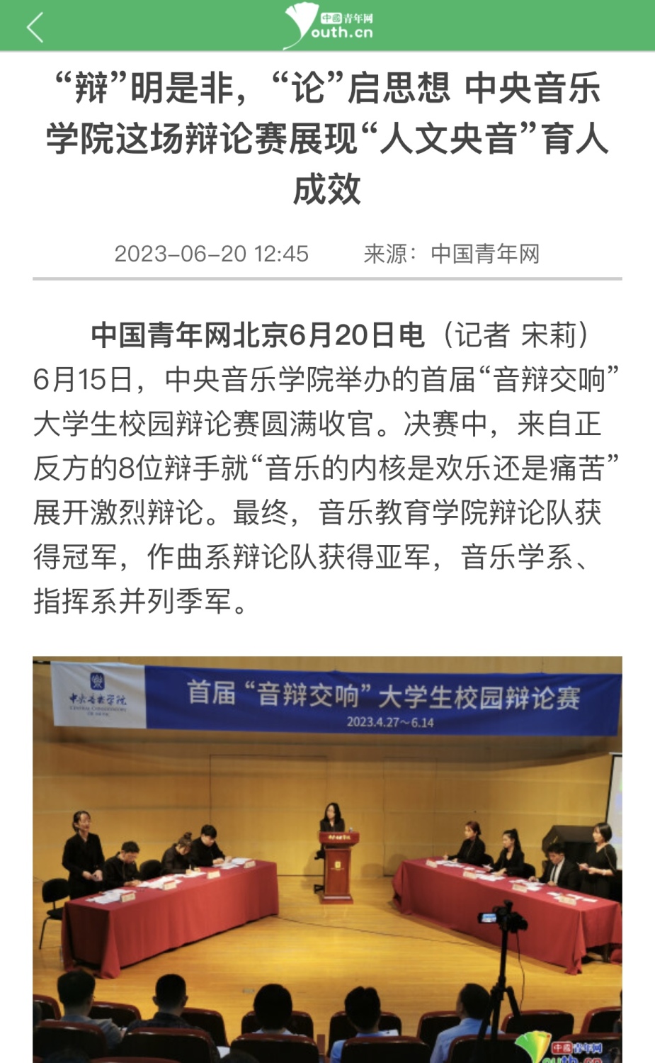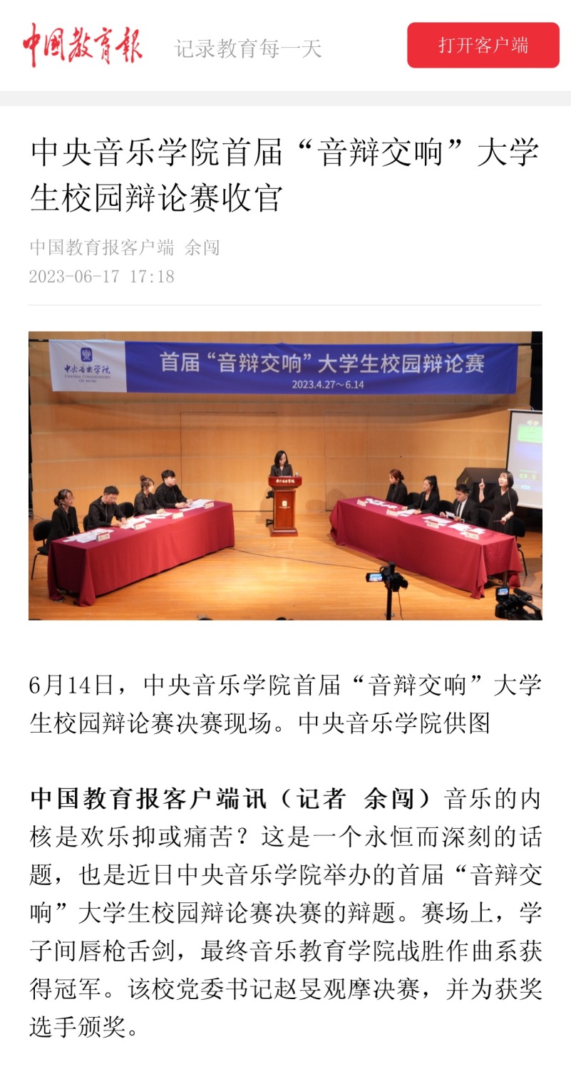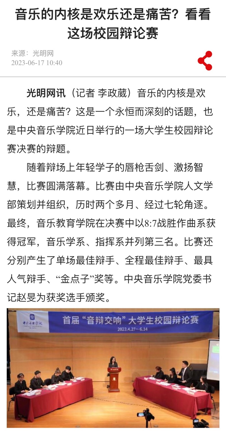 音乐的内核是欢乐还是痛苦?这是一个永恒而深刻的话题,也是米兰首届“音辩交响”大学生校园辩论赛决赛的辩题。6月14日,随着辩场上年轻学子们的唇枪舌剑、激扬智慧,决赛在琴房楼演奏厅圆满落幕。