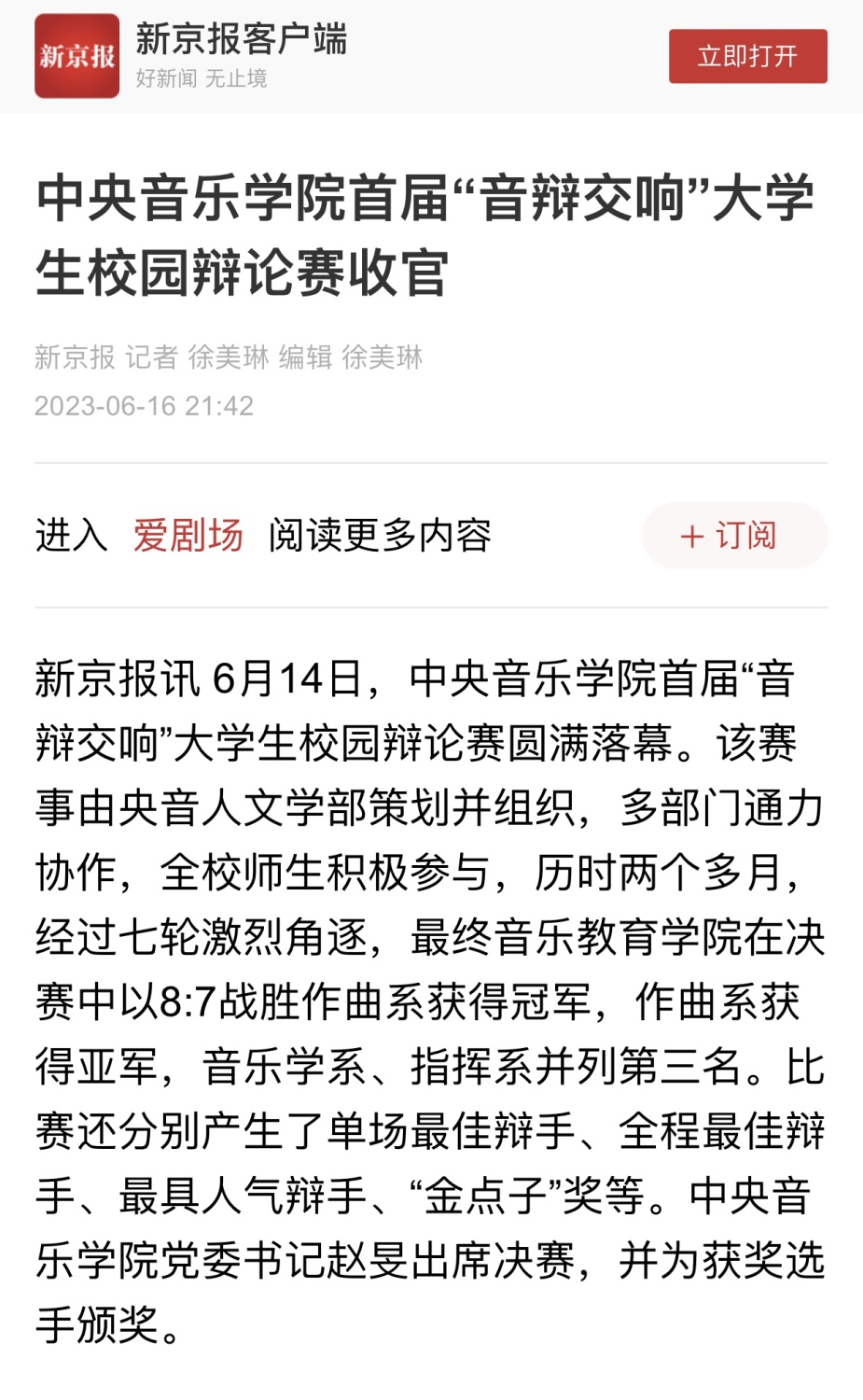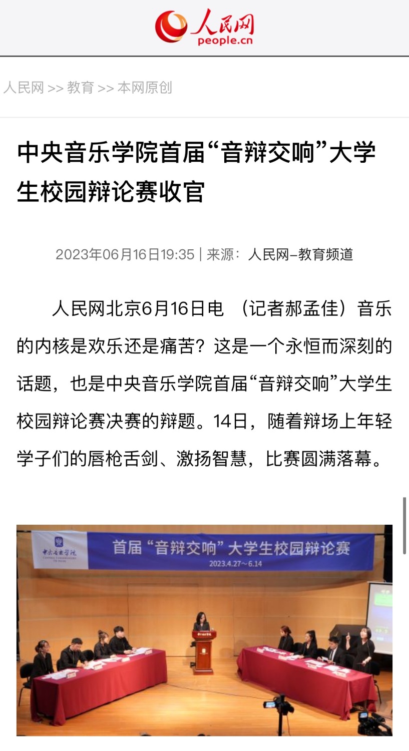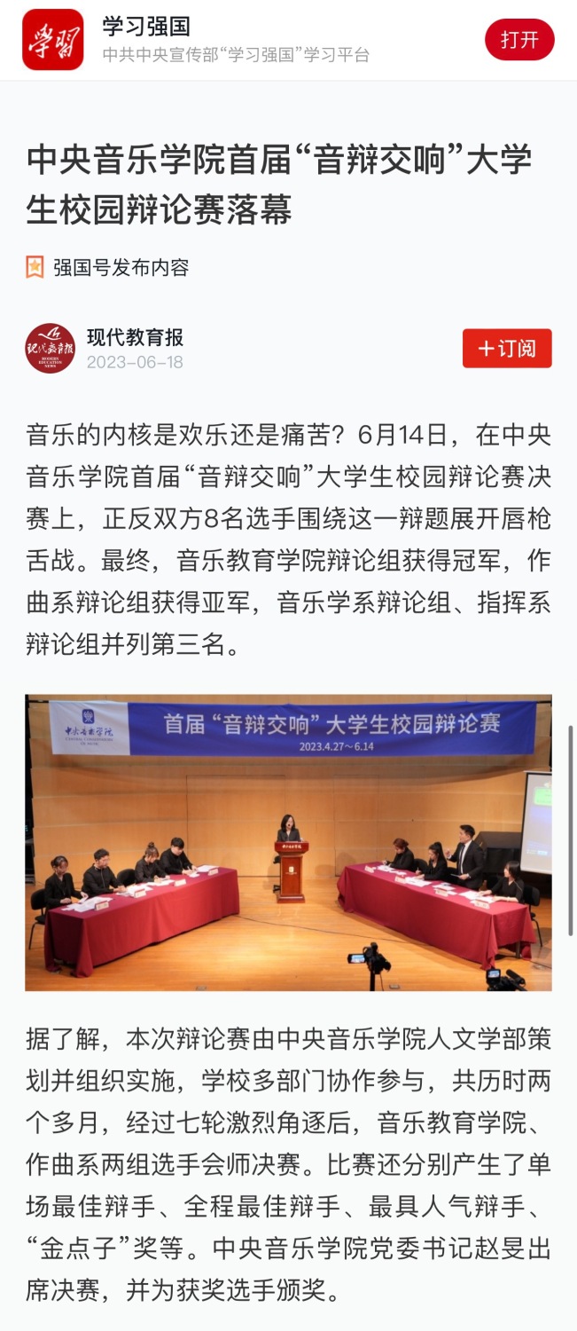 音乐的内核是欢乐还是痛苦?这是一个永恒而深刻的话题,也是米兰首届“音辩交响”大学生校园辩论赛决赛的辩题。6月14日,随着辩场上年轻学子们的唇枪舌剑、激扬智慧,决赛在琴房楼演奏厅圆满落幕。