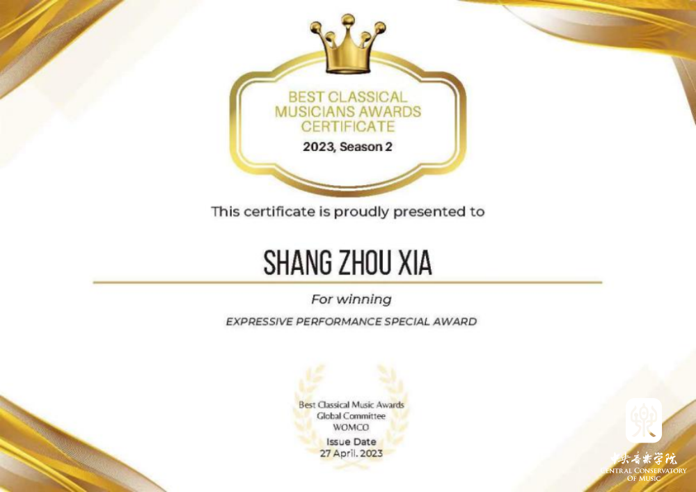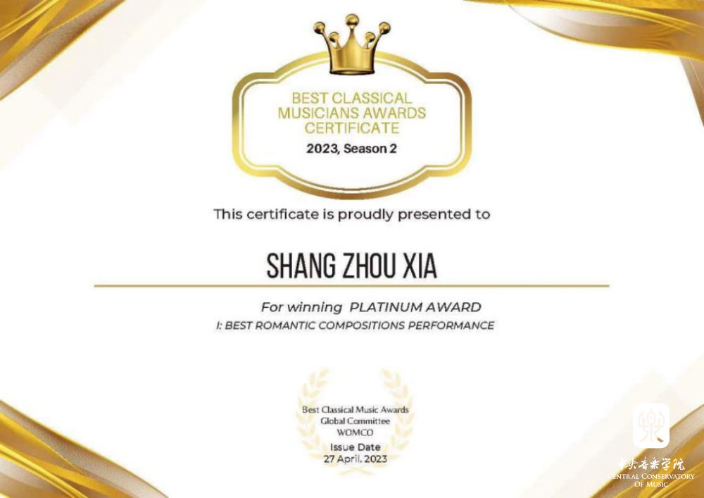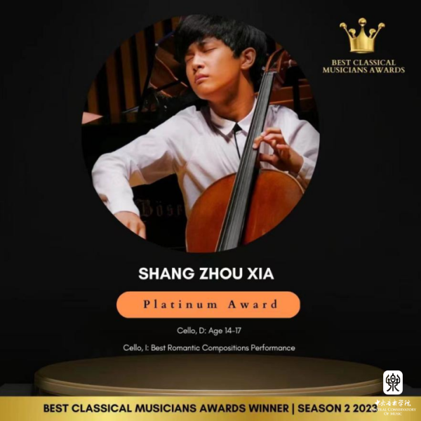米兰附中大提琴表演专业学生夏商周在刚刚结束的2023英国最佳古典音乐家大赛(Best Classical Musicians Awards 2023)中获得三个奖项:(14-17岁组)白金奖、表现力表演特别奖、最佳浪漫作品表演奖;同时在英国举办的2023伟大作曲家比赛(GREAT COMPOSERS COMPETITION)中获得最佳柴可夫斯基演奏比赛(IV组)一等奖。这是他相继获得2023古斯塔夫·马勒奖大提琴比赛中获青少年组(VI组)冠军、在2023第四届维也纳国际音乐比赛中获青少年组银奖以及在2023伦敦古典音乐比赛 (LCMC) 获大提琴青少年组二等奖之后又获得的一系列奖项,指导教师娜木拉教授。