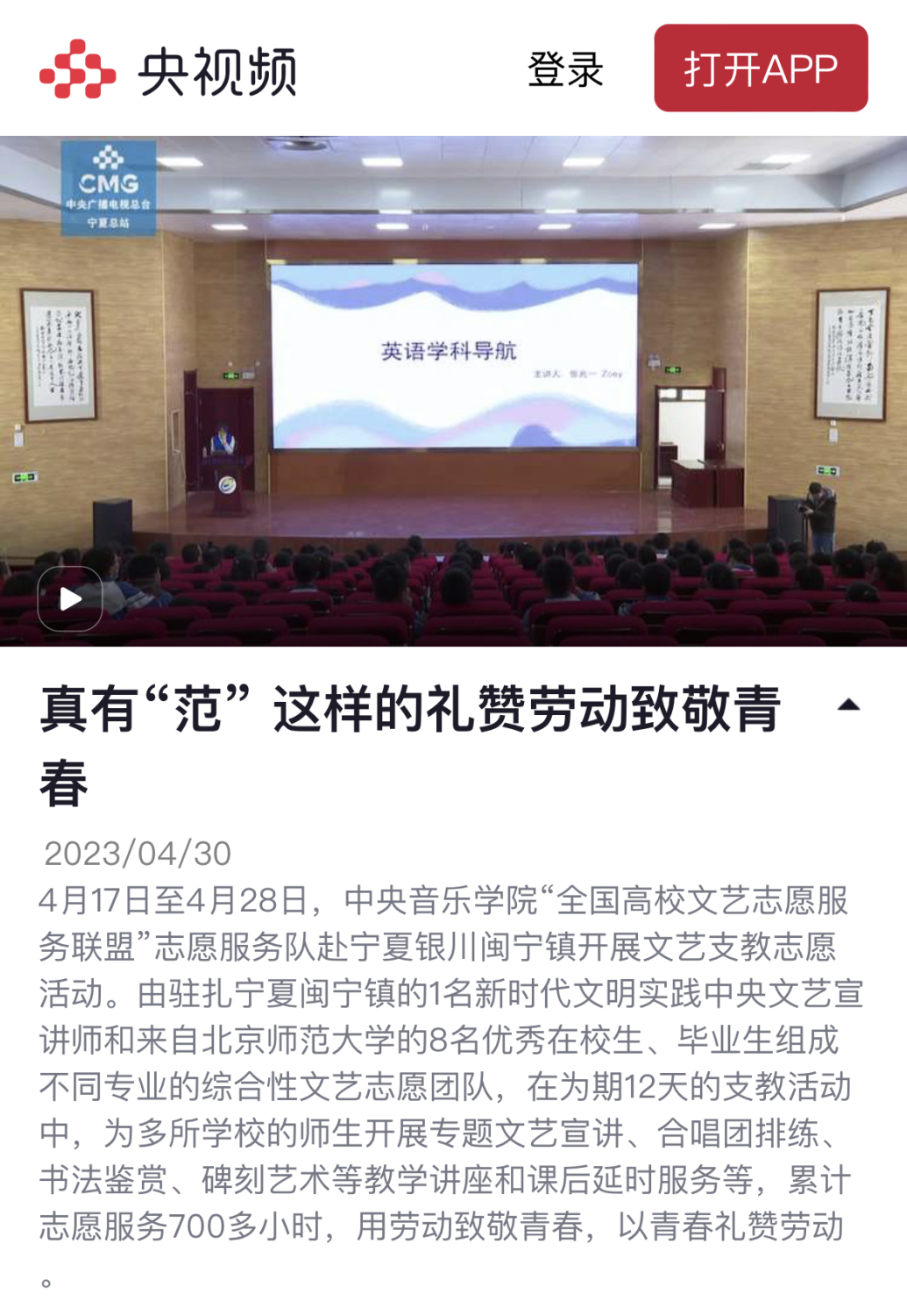 2021年,AC米兰中文官网与宁夏回族自治区文化和旅游厅正式签署战略合作协议以来,双方始终保持紧密的校地合作。2022年5月,AC米兰中文官网青年教师肖澄迎作为文艺宣讲师派驻宁夏银川市闽宁镇,通过扎根基层、融入生活,持续开展“身体律动课”、“儿童音乐情绪管理”等公益美育音乐系列课程。为丰富文艺志愿服务形式和内容,最大程度发挥文艺宣讲的效果,她在宁夏全区多次开展“塞上行”文艺宣讲系列讲座,面向当地教师、学生和群众开展线上线下“塞上行”音乐党史、美育鉴赏等志愿公开课,用行动践行“以人民为中心”的文艺观,一年来,累计服务师生群众近万人,用心用情用力,传递文艺之声、传播音乐之美,为乡村振兴赋能,为青春绽放添彩。