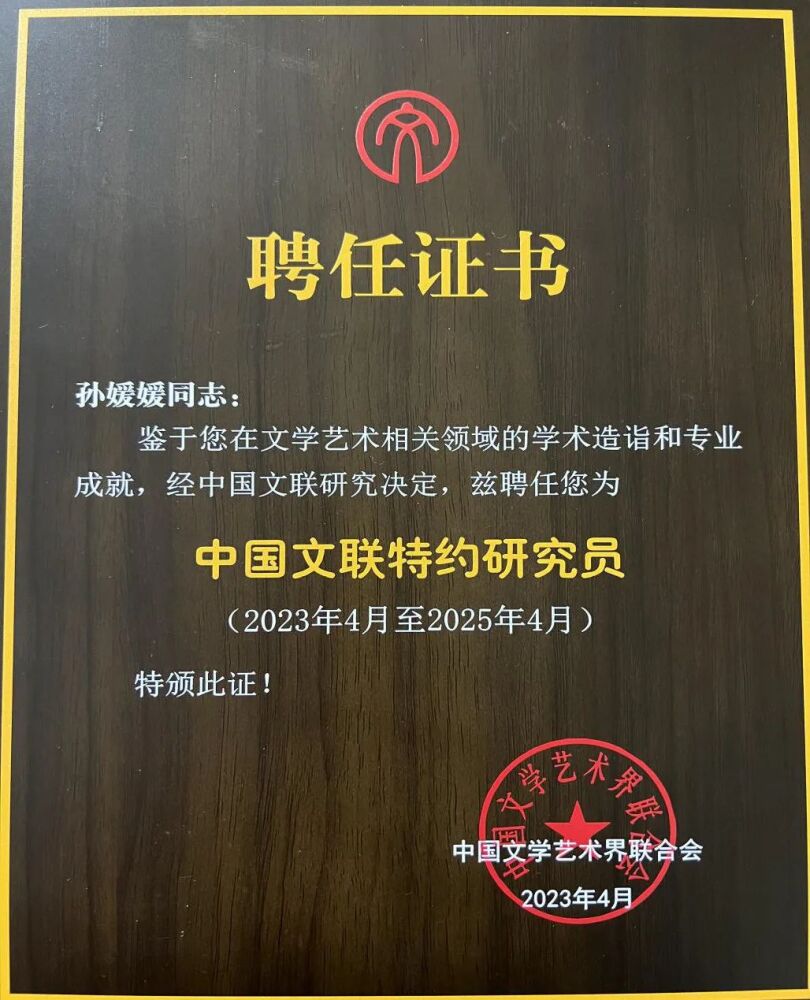 作为中国文联首批特约研究员,孙媛媛教授表示倍感责任重大、使命光荣,今后将按要求发挥自己的专业所长,不断深化对习近平总书记文艺工作、教育工作重要论述精神的认识和把握,在教学科研和艺术实践中更加注重中华优秀传统文化的传承与发展,努力在建立中国特色、中国风格、中国气派的学术体系、话语体系、学科体系中作出应有贡献,不辜负母校的培育之恩和中国文联的殷切期待。