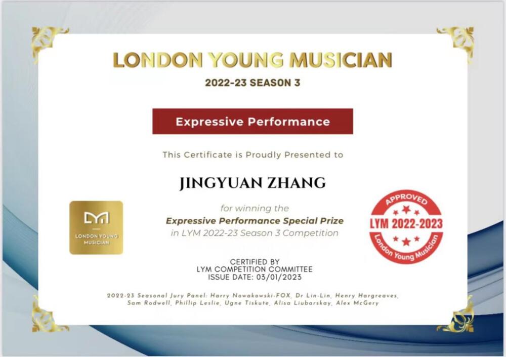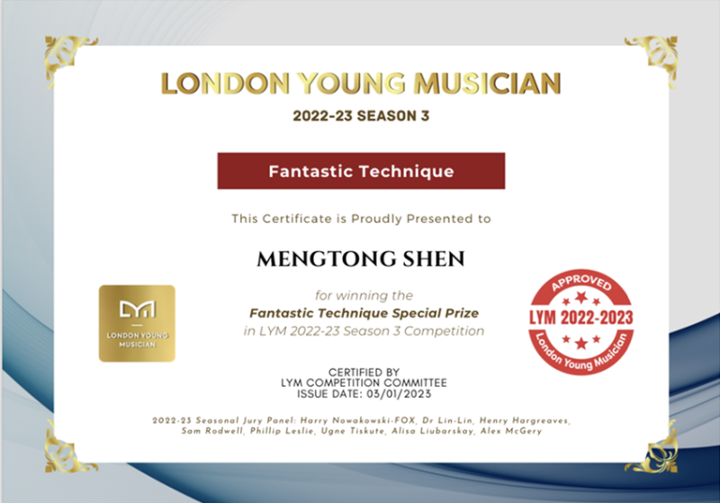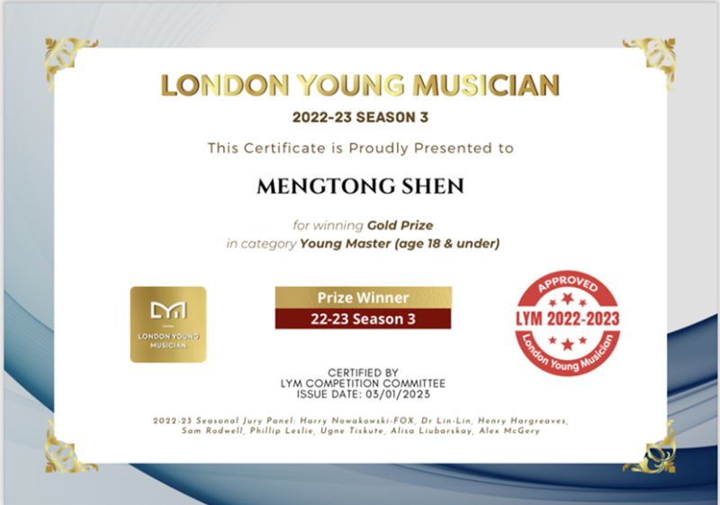 2022至2023年度第三届伦敦青年音乐家比赛金奖及绝妙技艺特别奖;