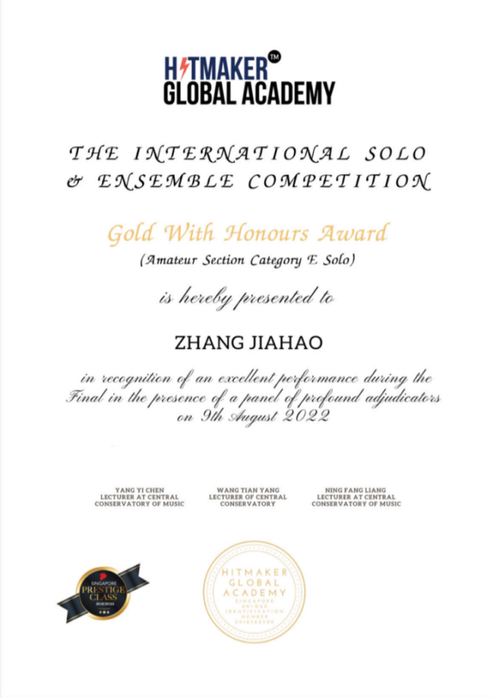 2022年获第四届新加坡国际独奏&重奏大赛荣誉金奖。