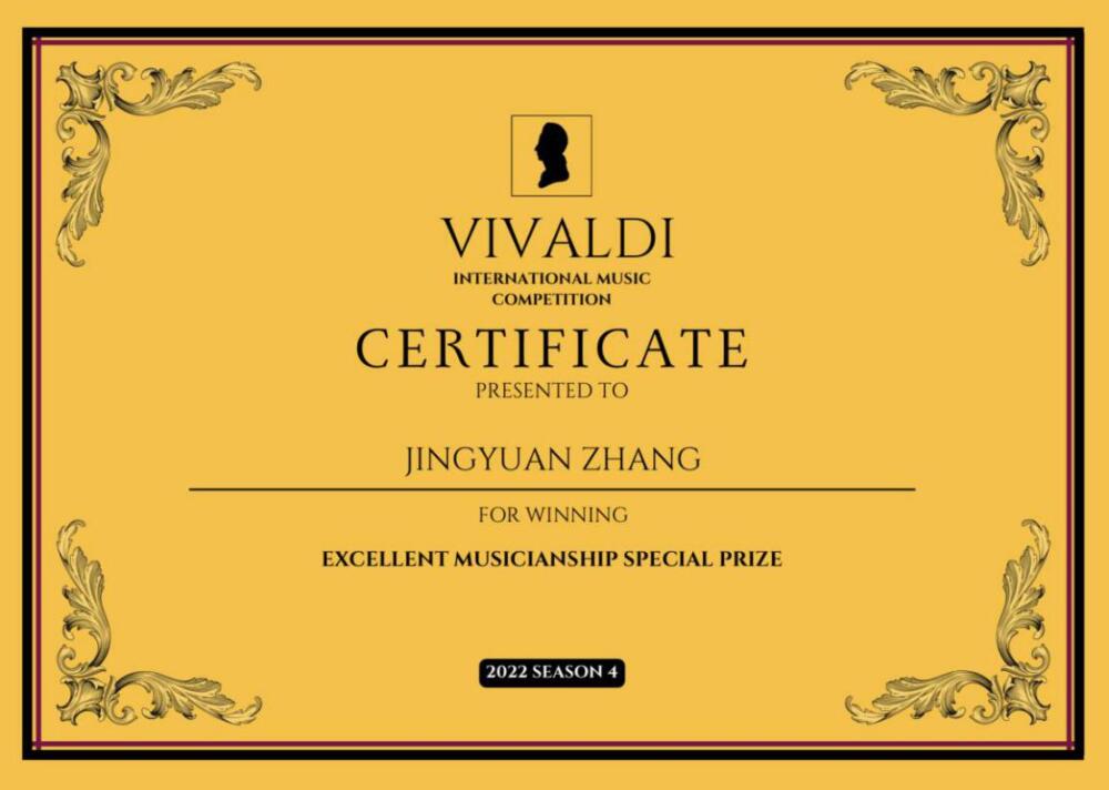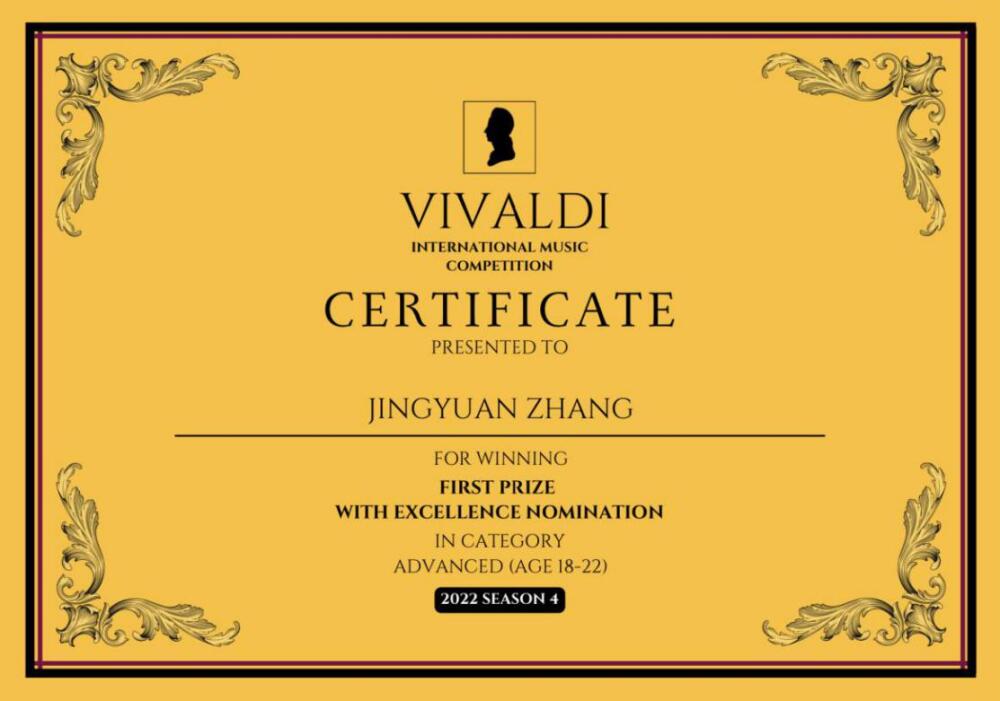 2022年维瓦尔第国际音乐比赛一等奖(优秀推荐)并获得优秀才能特别奖;