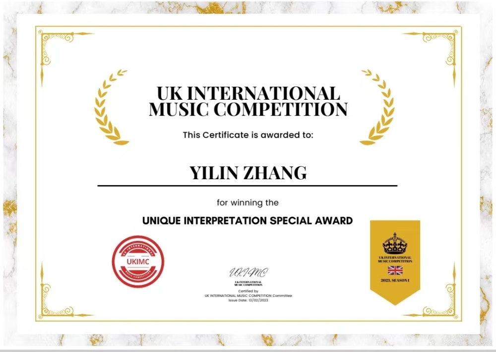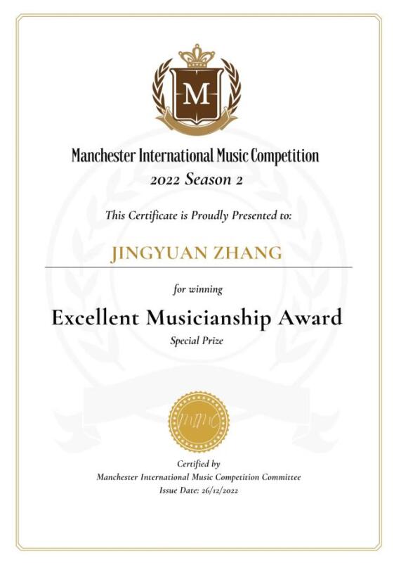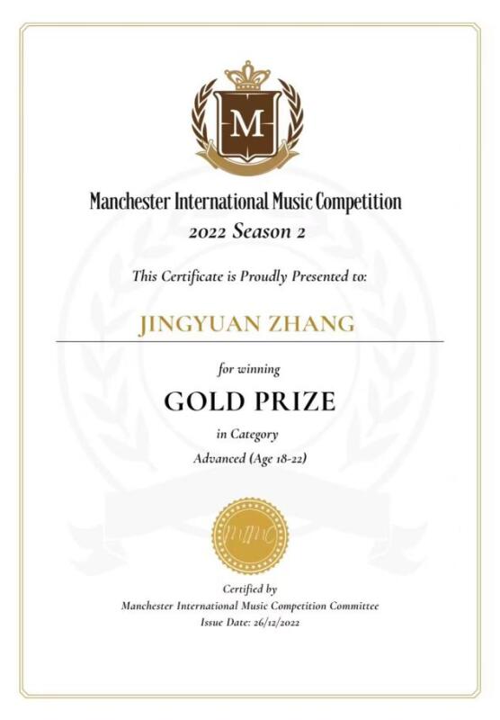 2022年曼彻斯特国际音乐比赛金奖并获得优秀音乐才能奖;