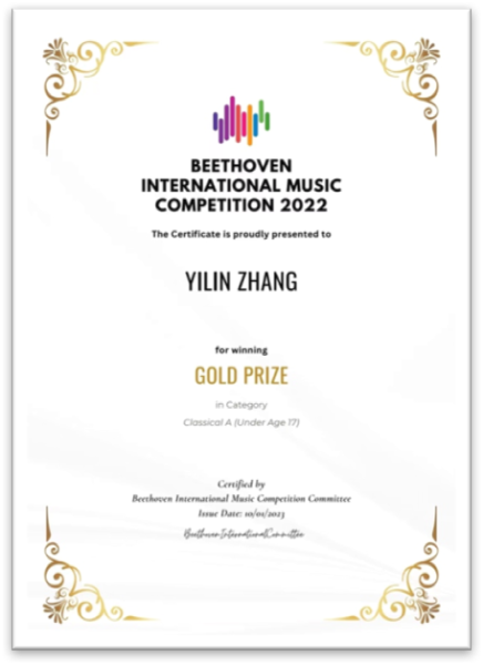 2022年第1届贝多芬国际网络音乐比赛古典A组金奖;