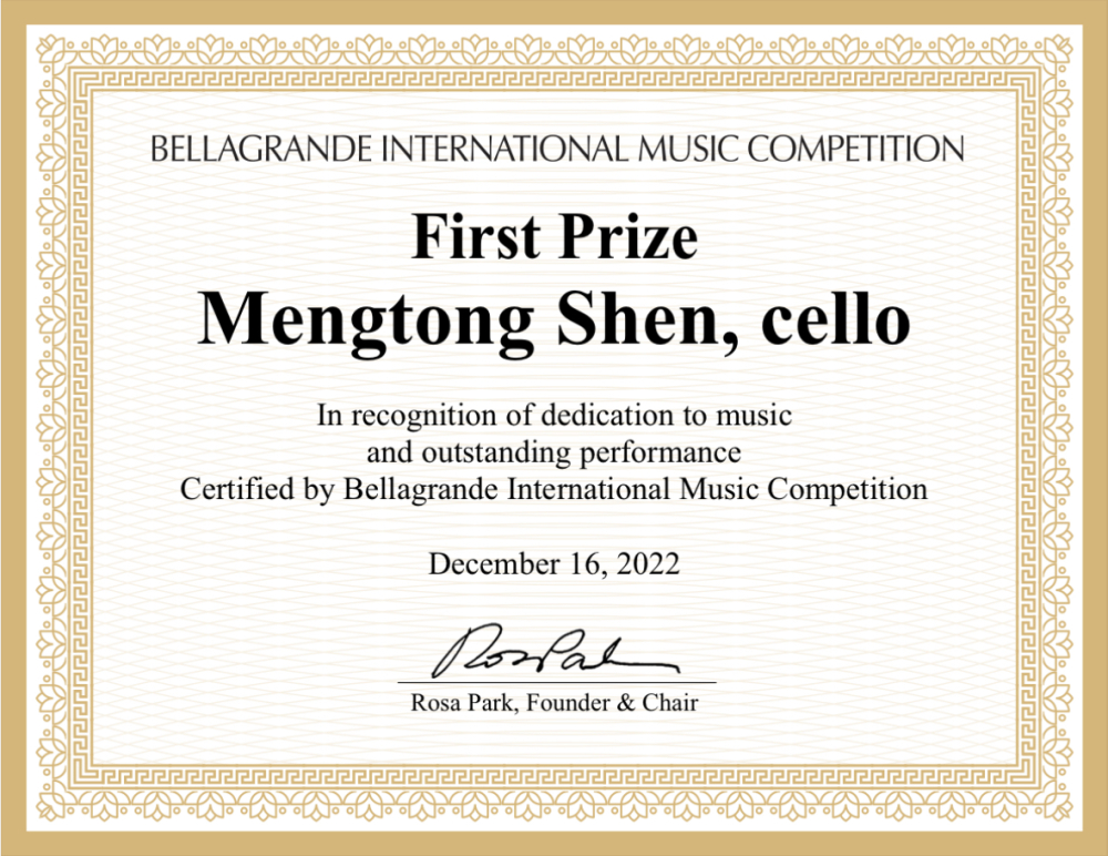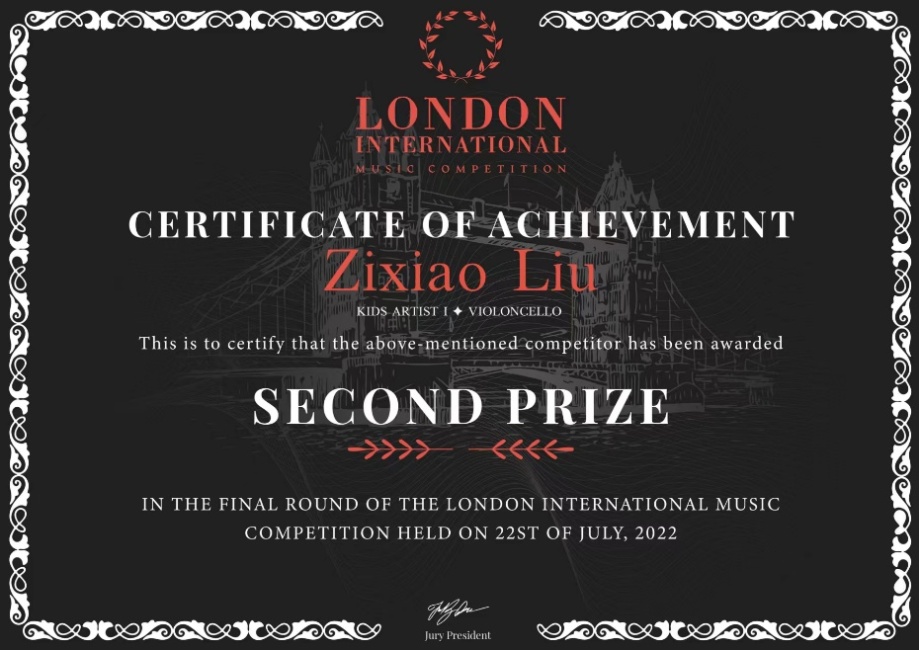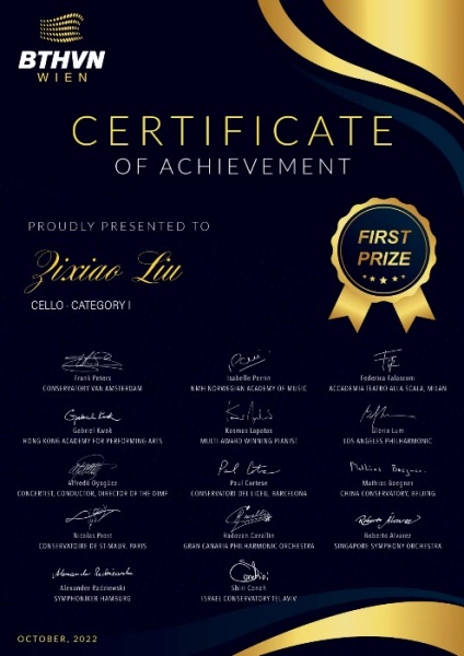 2022年荣获欧中Crescendo国际音乐大赛大提琴专业组少儿组一等奖;