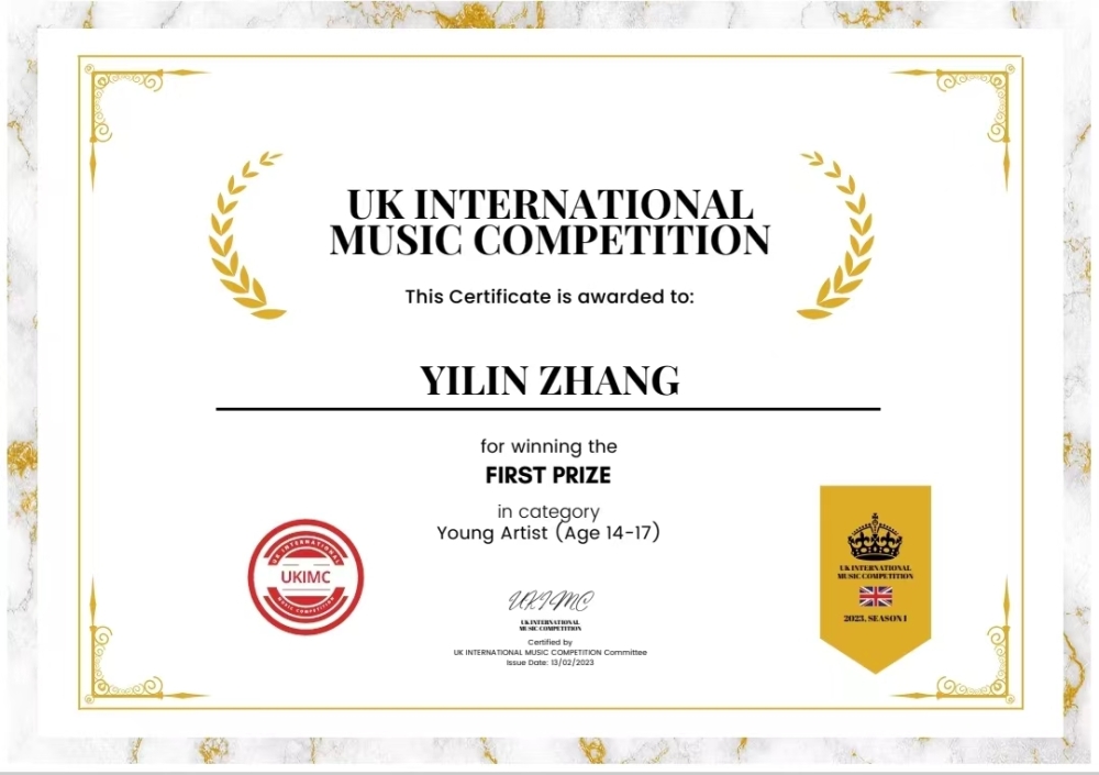 2022年第3季英国国际音乐比赛-网络音乐比赛14-17岁组一等奖;