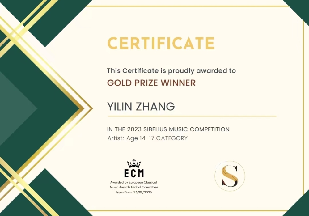 2023年古典音乐奖-西贝柳斯音乐比赛14-17岁组金奖。