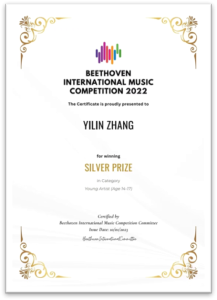 2022年第1届贝多芬国际网络音乐比赛14-17岁组银奖;