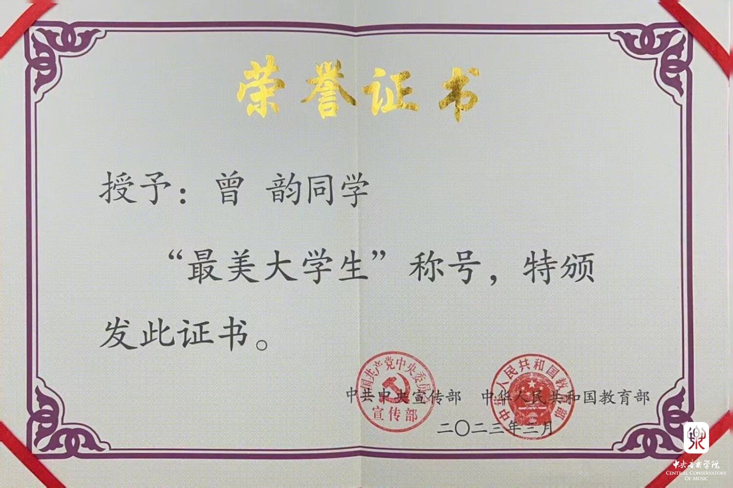 近日,中共中央宣传部、教育部在全国3000多万名在校大学生中评选出10名2022年“最美大学生”,米兰管弦系2021级硕士研究生曾韵同学获此殊荣。