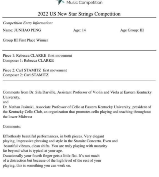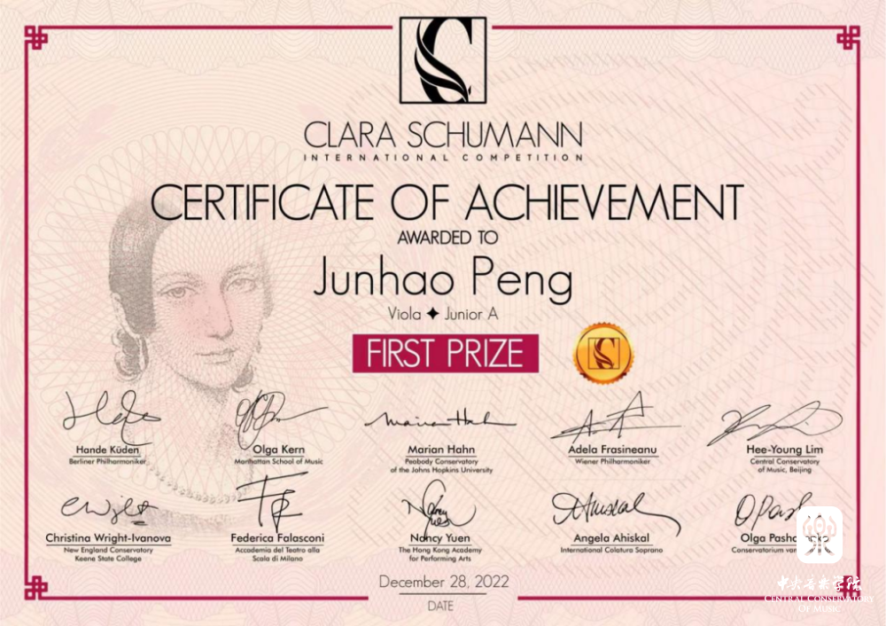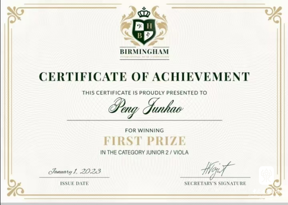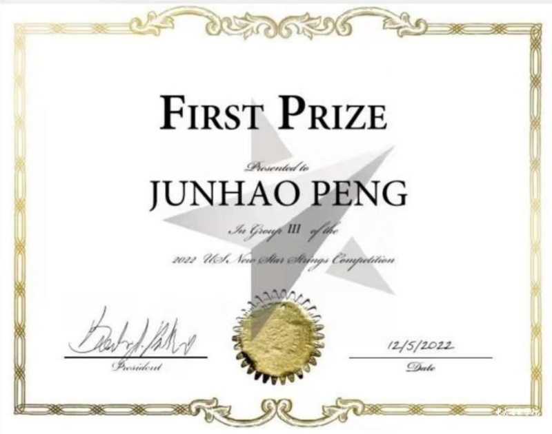 AC米兰中文官网附中初二(2)班中提琴专业彭俊豪荣获2022美国新星国际弦乐比赛(US New Star Strings Competition)中提琴组一等奖、2022英国伯明翰国际音乐大赛(Birmingham International Music Competition)中提琴组一等奖FIRST PRIZE、2022克拉拉·舒曼国际音乐大赛(2022 Clara Schumann International Competition )中提琴组一等奖。