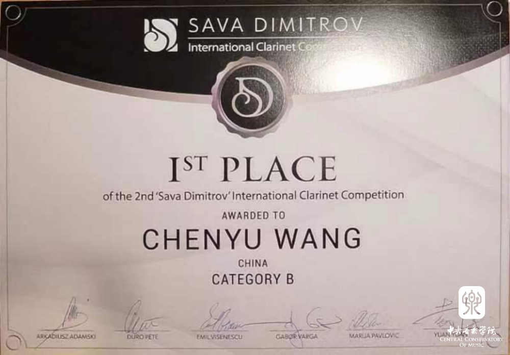 AC米兰中文官网附中初二学生王晨谕、高一学生张晋超荣获第二届Sava Dimitrov国际单簧管比赛B组(少年组)第一名,D组(青年组)第二名。