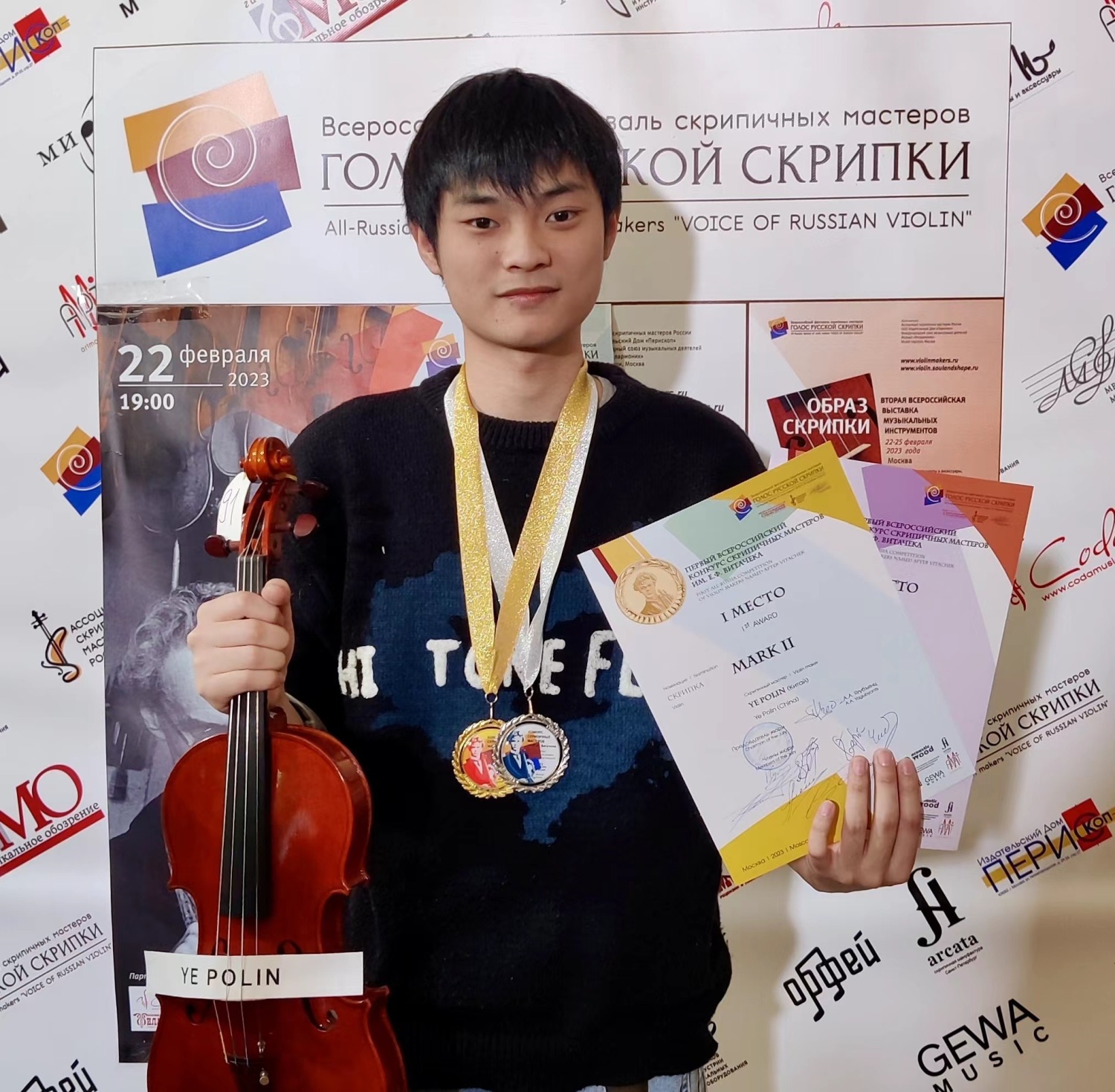 以E. F. Vitachek命名的全俄小提琴制作比赛,于2023年2月22日至25日在莫斯科举行,参赛选手不受年龄和国籍限制。经过三轮角逐,叶珀麟同学脱颖而出获得头奖,参赛的两把小提琴均为该同学就读本科期间着手制作,并于毕业后继续完成的作品。