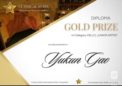 波兰古典之星国际音乐比赛,是一个诚挚邀请所有古典音乐家的国际比赛,设钢琴、弦乐、管乐、声乐等方向。每一位参赛者都将由具有国际声誉的评委小组进行评估,他们将以0-100分的标准对参赛者的表现进行评分。评分分为几类:技术熟练,音乐性格,乐感,音乐诠释与艺术视野以及准备的专业性。比赛将保留所有参与者的排名。评分系统:96-100分:绝对冠军(五星),91至95分金奖(四星),第86至90分:银奖(三星),81-85分:铜奖(二颗星)70至80分桂冠(一星)。高钰坤在本次大赛中,获得8颗星的绝佳成绩,荣获了本次大赛的少年艺术家金奖和浪漫主义时期金奖两个奖项。