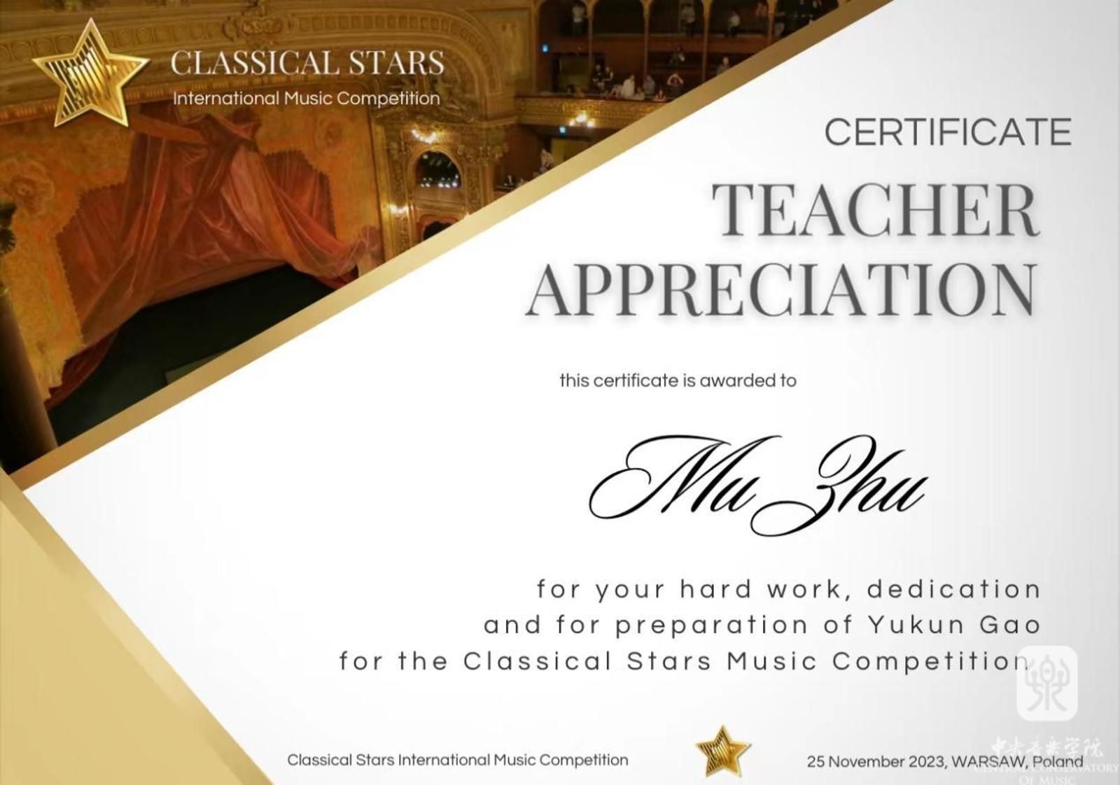 米兰附中初一年级大提琴专业学生高钰坤在近日参加的2023波兰古典之星国际音乐比赛中,脱颖而出,荣获本次大赛青少年组(12-14)少年艺术家金奖和浪漫主义时期金奖两个奖项,指导教师:朱牧。