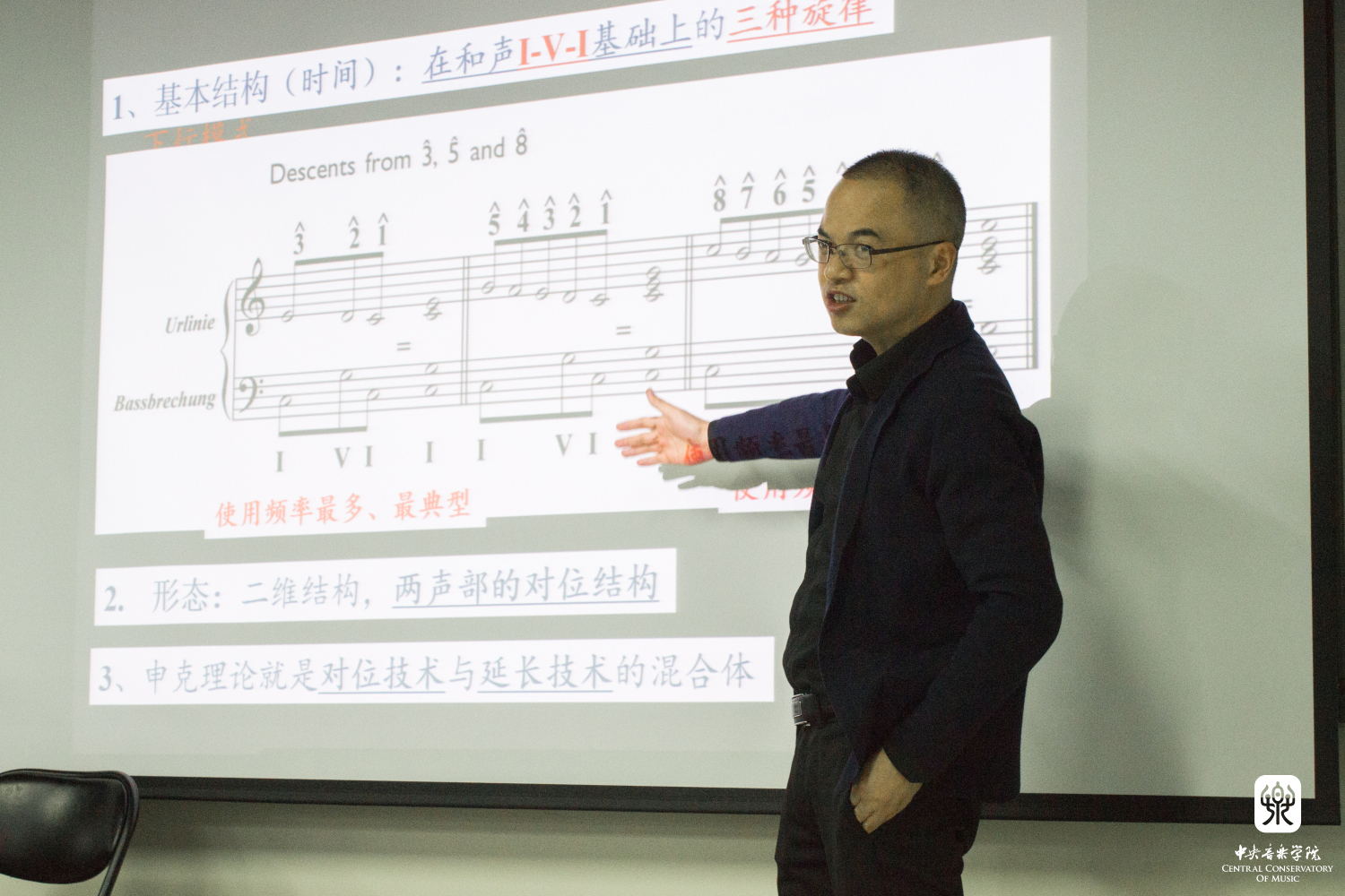 杨和平教授带来“时间与空间、结构与延长——广义申克音高组织矢图”。杨老师从申克理论的基本结构和结构层次这两个重要概念出发,对申克的延长技术、分析与作图步骤等理论进行详尽讲解。同时他还展望了后申克理论在对20世纪音乐的分析中所起到的作用和理论自身产生的适应性变化。总结了申克理论在被运用时需遵从作品发展规律的“顺势而为”之特点。