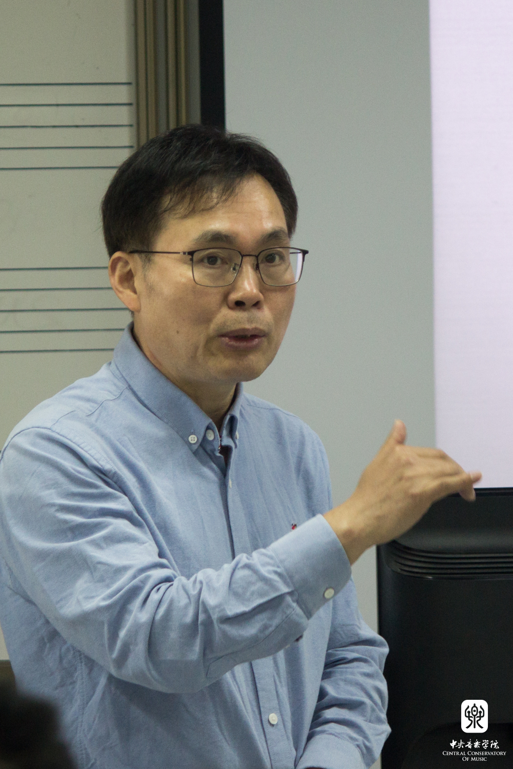 最后四场讲座在10月19、20日两天举行。10月19日下午,王中余教授带来“阿伦·福特音级集合理论初步”的讲座。王老师从音级集合理论的缘起、理论的要点、理论的运用三个方面展开他的讲座。首先他叙述了在音级集合理论创立之前无调性音乐分析的现状及理论准备情况,阿伦·福特并非音级集合理论的创始人,在他创建音级集合分析法之前已有诸多该理论的积累;阿伦·福特将这个理论提炼成一种构建作品音高的方法,并使之可以运用于后调性作品的分析中。随后他着重介绍了音级集合理论中的诸多要点,诸如:音级、音级集合、标准序、基本型、音程级、音程含量、相等关系、Z关系、相似性关系、包含关系、互补关系等;最后王老师以一些实例阐释音级集合理论在创作中、分析中的运用。