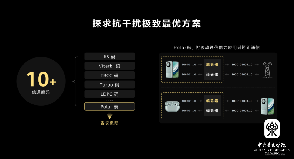 传输问题上,码率不足、抗干扰差是TWS耳机实现无损音质的两大瓶颈。华为FreeBuds Pro 3物理传输带宽高达8Mbps,是业界传统蓝牙带宽的4倍,从而实现耳机1.5Mbps的传输码率。但无线传输码率越高,其对信号抗干扰能力的要求也越高。为此,华为首次将移动通信的Polar码技术应用在耳机上,耳机的传输抗干扰能力相较上代提升了2倍,实现了稳定的高码率传输。既保留无损音频的饱满细节,又保障用户流畅的聆听体验。