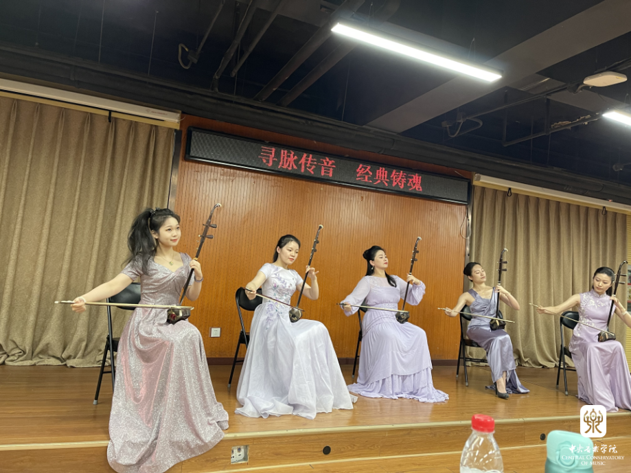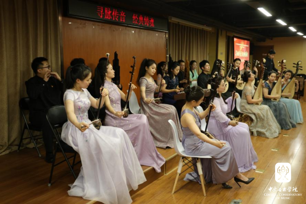 在参观完新京报社后,民乐系学生党员以“寻脉传音 经典铸魂”为主题,举办讲演音乐会。新京报社党委书记、社长刘军胜,新京报社党委副书记李丽辉,新京报社副社长郭强,新京报社副总编辑孙浩等到场。在每首作品演奏之前,主持人王磊教授为大家介绍了中国的传统乐器,以及每部作品的表达内容。音乐会所选曲目中,有大家耳熟能详的红色经典,也有各专业最具代表性的作品,包括唢呐独奏《胜利秧歌》、古筝齐奏《山丹丹开花红艳艳》、阮齐奏《丝路驼铃》、笙齐奏《冬猎》、琵琶齐奏《唱支山歌给党听》、二胡齐奏《光明行》,最后集体合奏《我的祖国》。音乐会用中国民族音乐传承者的风采,彰显新时代青年人的昂扬自信,用中国的民族乐器,传递贯通古今的家国情怀;用丰富多彩的编制组合,诠释一脉传承的红色基因。