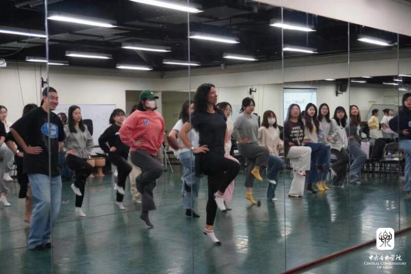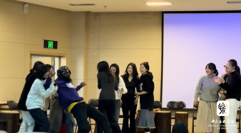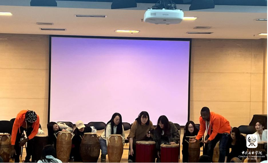 在第一场工作坊中,两位音乐家带领在场师生学习了加纳传统音乐KPATSA SONG的歌舞表演,一唱一和的歌声此起彼伏,配合着鼓的节奏与手掌拍打声以及热情的舞蹈动作,整个教室都洋溢着活力。