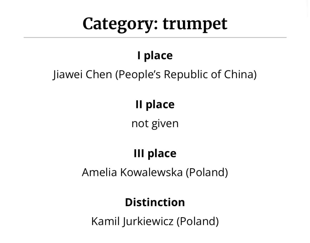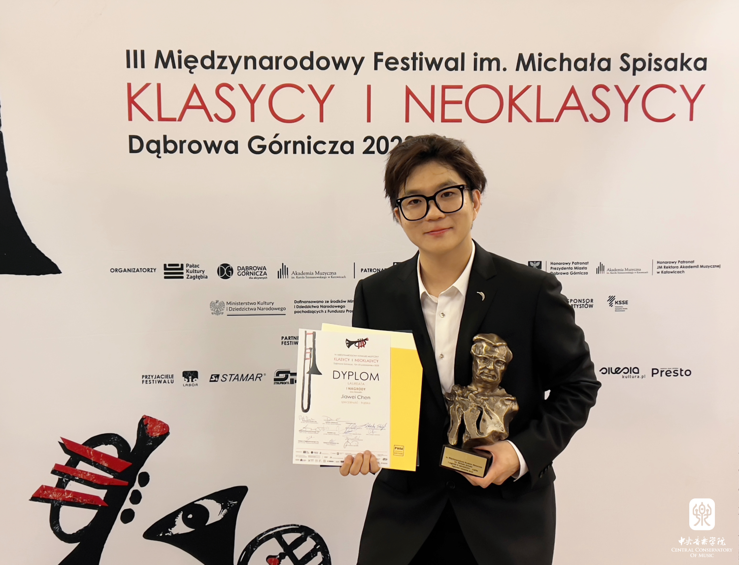 据悉,本次比赛通过预赛后进入正式比赛,正式比赛共分为三个阶段,每一阶段都是一场紧张而又激烈的角逐。其中,陈嘉伟与其他选手同台竞技,展现出非凡的才华和出色的实力,是决赛四位选手中唯一一位中国选手,赢得了在场评委的高度赞誉,最终荣获第14届米哈乌·斯皮萨克国际音乐比赛(14th Michał Spisak International Music Competition)小号专业第一名(第二名空缺)。