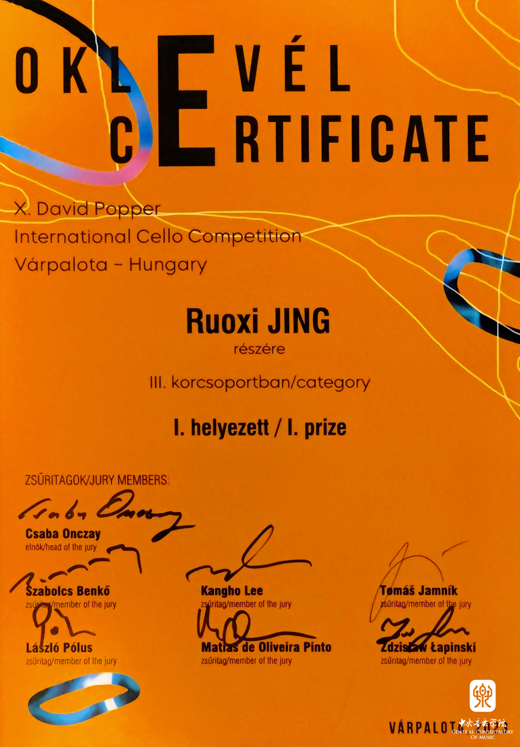2023年10月获得第十届大卫·波帕尔国际大提琴比赛第Ⅲ组一等奖;