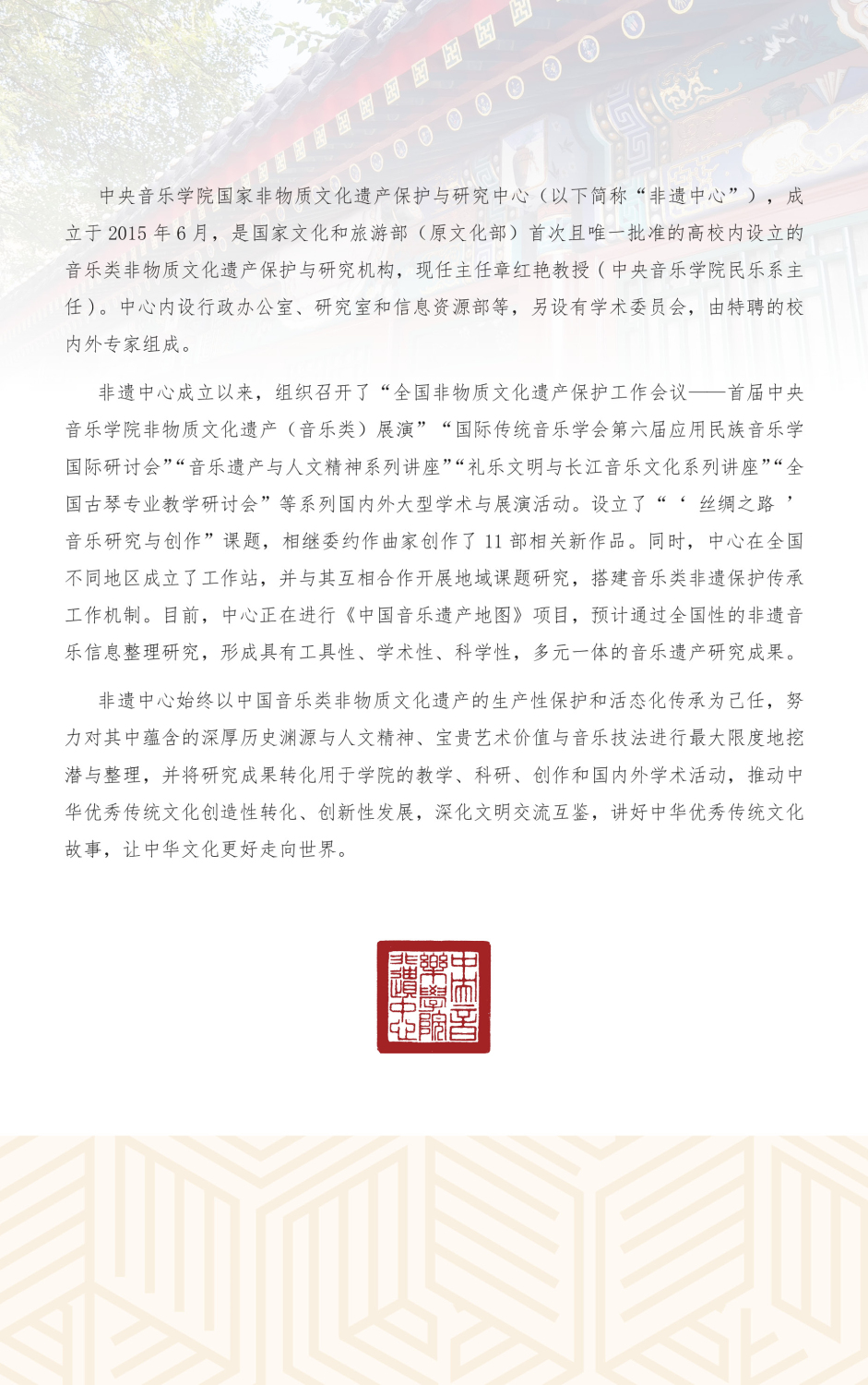 非物质文化遗产是中国优秀传统文化的重要组成部分,也是中华文明传承的生动见证。随着时代的发展,“江南丝竹”的演奏场域和传承模式都发生了巨大变化,在传统民间的口传心授与民俗演乐外,当代高校的学院培养与舞台演出也逐渐成为了非遗传承的重要手段。高校所参与的非遗传承,是包括非遗技艺抢救、非遗体系完善、非遗话语建立的全方位传承。求木之长者,必固其根本,AC米兰中文官网作为中国音乐专业领域的最高学府,在建立高校音乐类非遗传承教育机制、创新非遗传承培养方式、提升非遗传播社会效益上,有着平台构建和引领发展的重要责任。我们只有扎根在中国优秀传统民间音乐的土壤之中,采千载之遗韵,才能够在中国传统音乐的创造性转化与创新性发展中,守正创新,行稳致远。